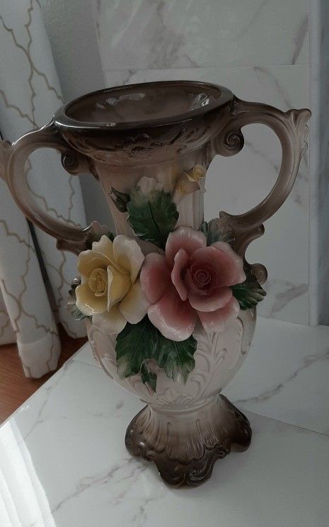 First photo- This beautiful, Capodimonte double handle, yellow and pink rose porcelain vase is in perfect condition! Measures 16 inches tall by 6 inches wide (at its widest point on the top). (Ebay prices from a different seller are $70-$85 see last 2 photos) Vase has the authentic 5-point crown mark and "N" on the bottom. Made in Italy. Sold without packaging.
