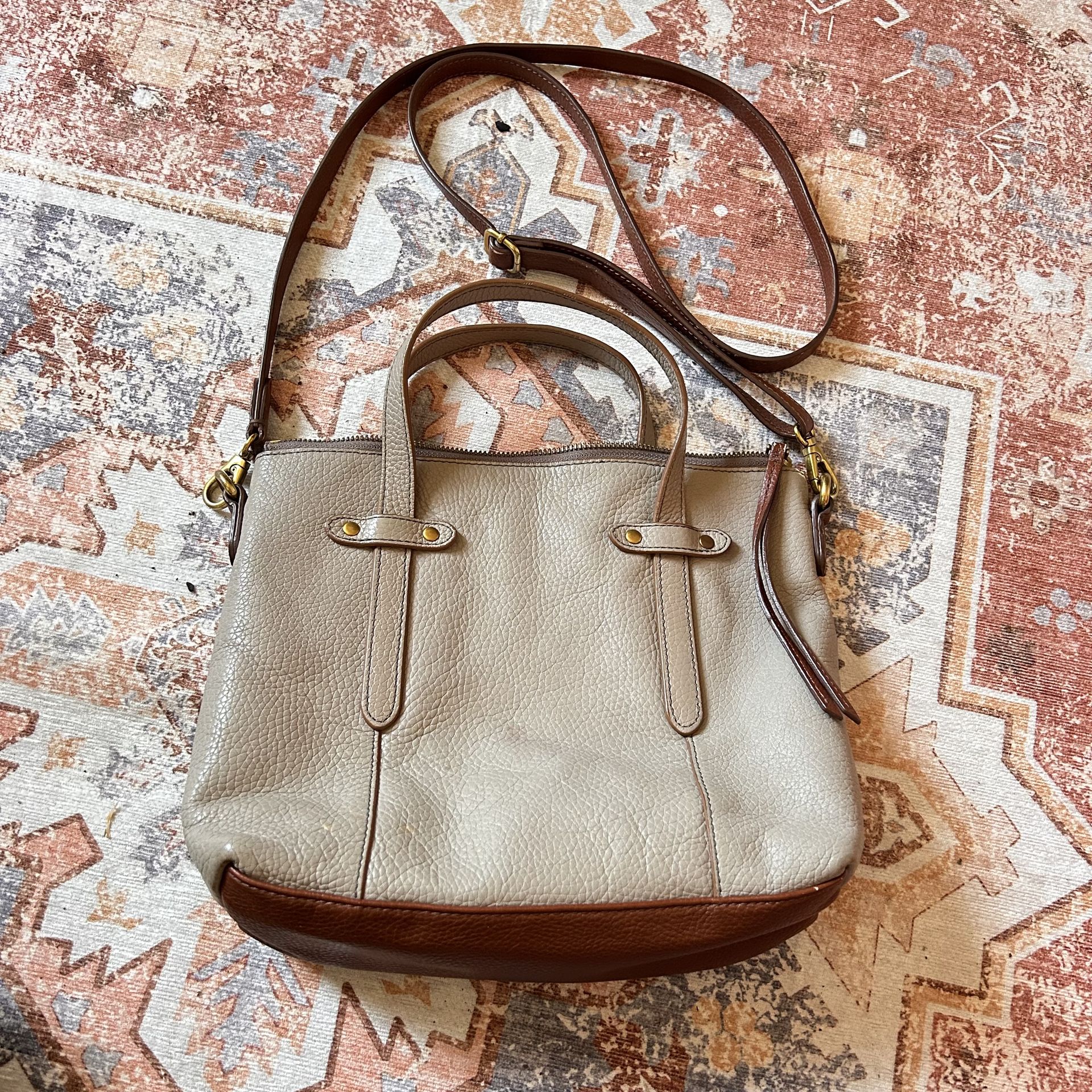 Cute Fossil neutral gray taupe leather bag. The bag is lined with blue gray fabric and has a medium size, measuring 14" in width, 10" in height, and 3 1/2" in depth. It has a classic theme and is suitable for many occasions.