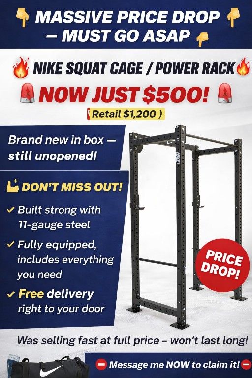 π₯NIKE SQUAT CAGE β BRAND NEW IN BOX Nike Squat Cage / Power Rack β Brand new, never used β still in box πͺ Heavy-duty commercial-grade steel π Full squat rack with pull-up bar ποΈ Perfect for home gym or professional setup ποΈ FULLY EQUIPPED β COMPLETE SET Includes everything you need: β’ (4) Vertical uprights β’ Pull-up bar β’ Crossmembers β’ Safety spotter pins β’ J-cups β’ All hardware & anchor sleeves π§ ACCESSORY COMPATIBLE β’ Works with Nike Spotter Arms β’ Nike Dip Station β’ Other 5/8β attachments π SPECS β’ Dimensions:93β H x 53.5β W x 40.75βD β’ Pull-Up Bar Diameter: 1.25β β’ Total Weight: 275.6 lbs β’ Safety Pins Capacity: 925 lbs β’ Pull-Up Bar Capacity: 475 lbs β’ J-Cup + Rack Capacity: 700 lbs β’ Tubing: 3β x 3β β’ Hole Spacing: Every 2β (numbered every other hole) β’ Must be anchored to floor π° Asking Price: $500.00 πΈ Retail Price: $1,200.00 (huge savings!) π FREE DELIVERY INCLUDED Serious buyers only. First come, first served. Message me if interested!