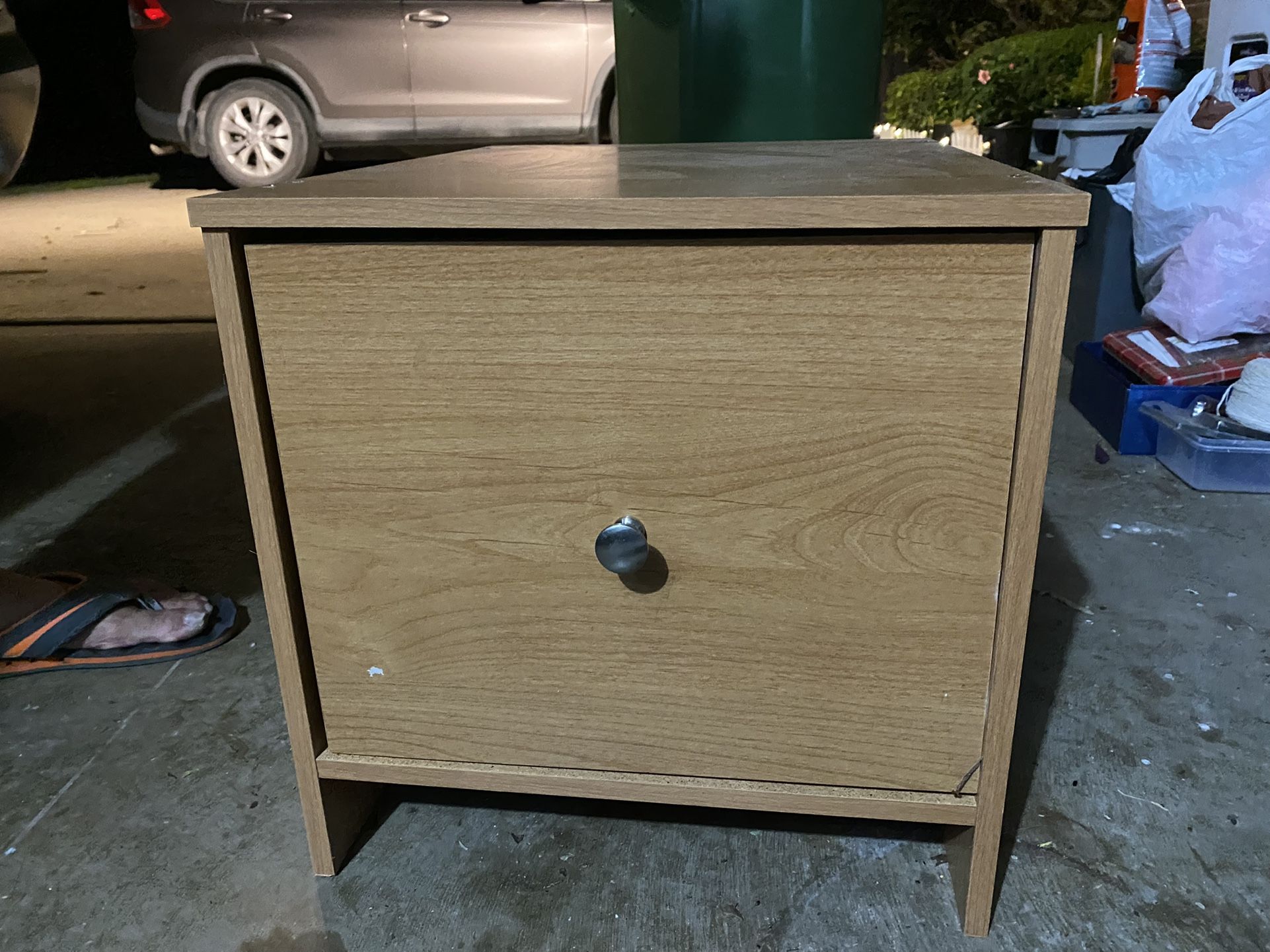 Small brown cabinet to hold items Square design Dimensions: 20” depth, 15.25” sides