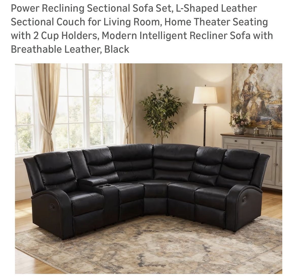 BRAND NEW IN BOX ( opened to see product ) L-shaped sectional couch with 2 cup holders, Black Faux breathable leather. Must pick up only.
