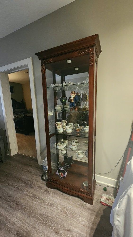 Beautiful 5-shelf lighted curio cabinet / vitrine display case in rich dark wood (mahogany/walnut tone) with elegant carved details on the top and base. Perfect for showcasing your collectibles, teacups, figurines, crystals, or other treasures! Features: Tall freestanding design 5 adjustable/tempered glass shelves for flexible display Built-in interior lighting Clear glass front and sides for full viewing from multiple angles Mirrored back Sturdy wood construction with classic curved base and crown molding Great used condition—clean, no major scratches/damage, glass intact, lights work Currently displaying a fun mix of items (teapots, cups, collectible figures), but ready for your collection! Ideal for living room, bedroom, or hallway accent. Heavy and tall so local pickup only in Pittsburgh area: no shipping. Easy to move with help. Comes empty Smoke-free home. Asking $150 OBO—message with any questions or to see more photos!