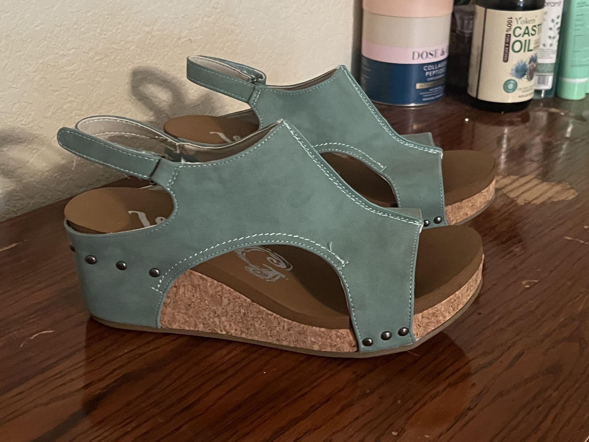 Brand new with box, women’s Isabella, suede, turquoise wedge shoe, size 11 asking $28