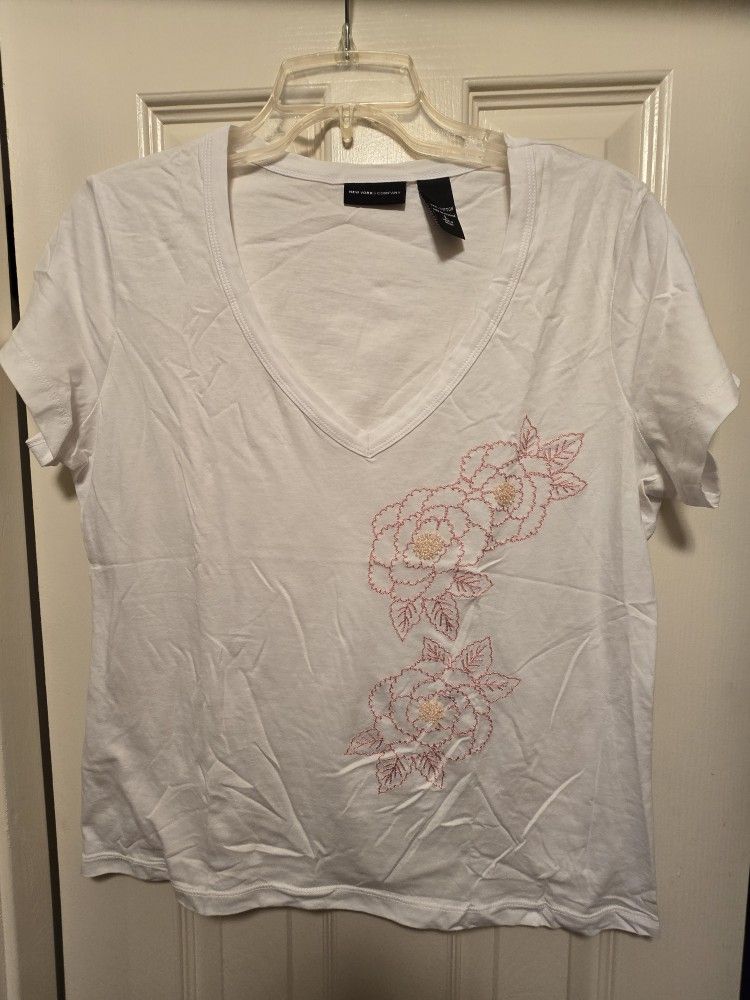 White shirt with rose color floral embroidery and bead details. Size L. New York & Company