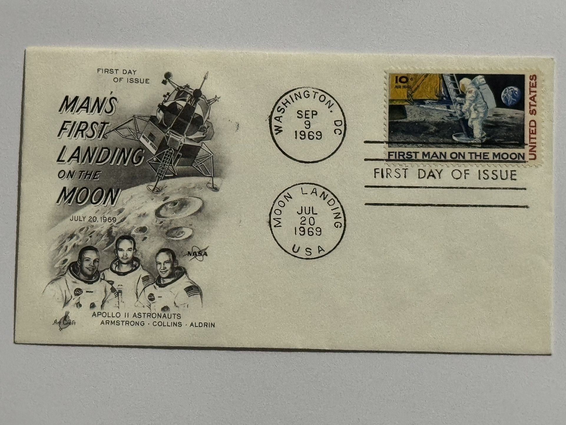 First Day of Issue Envelope and Stamp First Day of Issue Envelope Washington D.C. 1969 Man’s First Landing on the Moon July 20, 1969 Apollo 11 Astronauts Armstrong, Collins, Aldrin NASA First Man on the Moon 10 Cents U.S. Postage Uncirculated Uncertified Ungraded $20 Check out our other many exciting items! Lots more being added all the time!