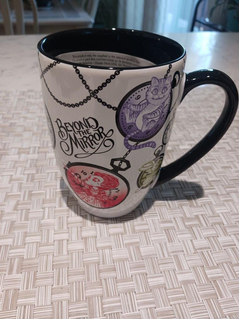 Official Licensed Disney Store Cup/Mug. Alice In Wonderland " Beyond The Mirror" 12 Ounces. Measures 5" Tall. Excellent Condition!