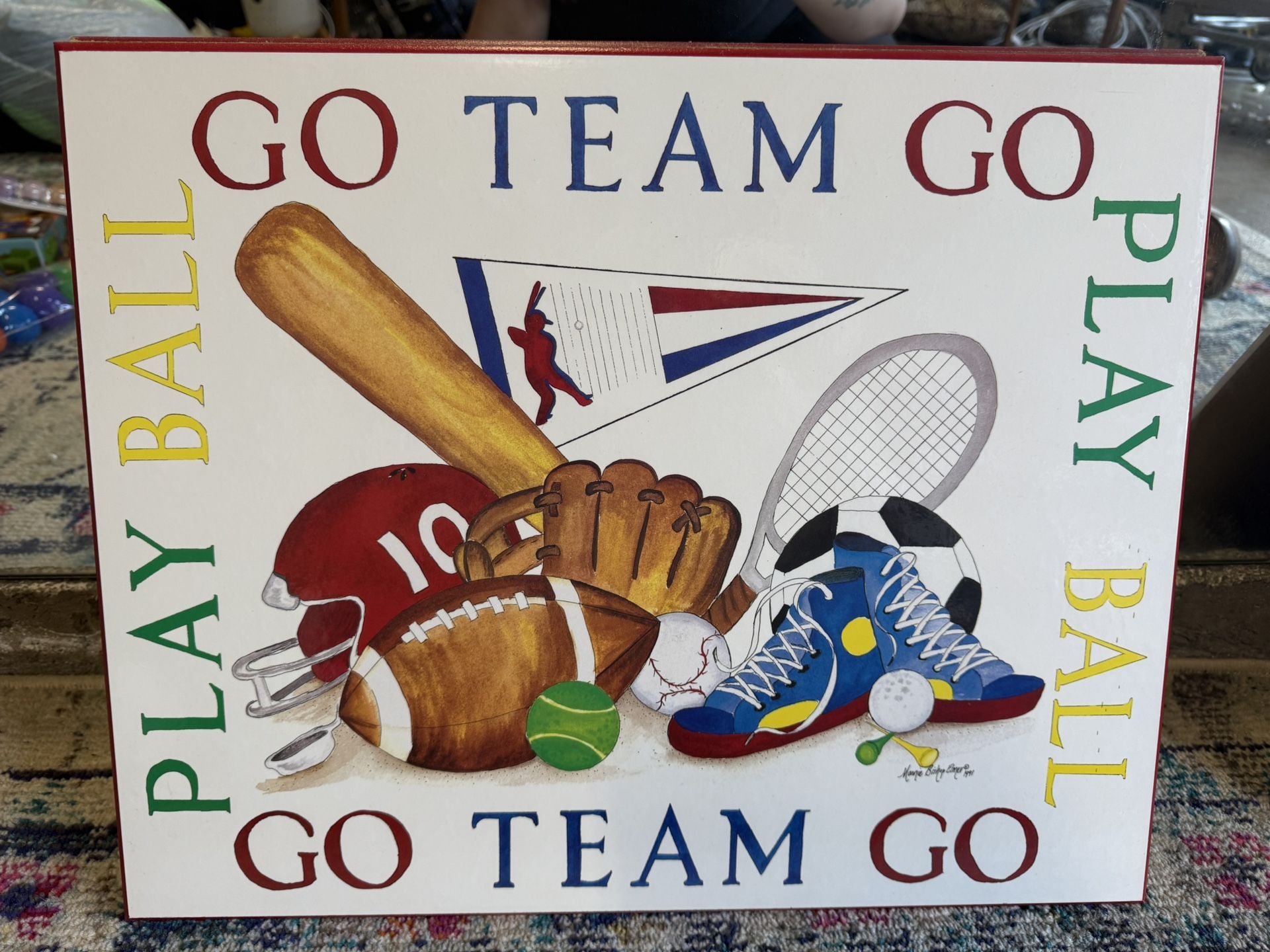 Vintage Sports Wall Art – Wood Colorful wooden sign with classic sports gear—baseball, football, soccer, tennis. Great for a nursery, kid’s room or sports-themed space. Like new condition. Dimensions 19.5” x 16” Pickup in Des Moines
