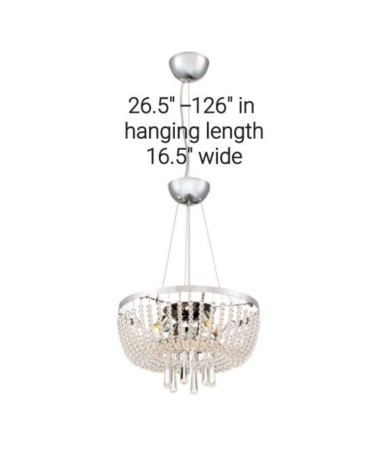 Chrome Accent glass pendant that uses five 40w maxium G9 base light bulbs which are supplied and can replacement bulbs are readily available at Lowes, Home Depot, online, etc. Damp rated for indoor and outdoor use Hanging height adjustable from 26.5" to 126". Width 16.5" This beautiful piece was purchased as a store display. Three of the hanging crystals are intact and the other two were already broken when purchased. Unfortunately, this piece was too long for the area I had in mind for the renovation it was purchased for and has not been installed. Public meet-up. Cash and electronic payments accepted.