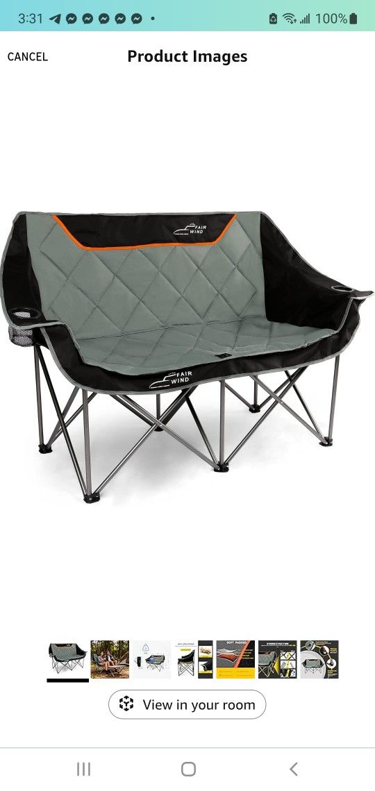 Relax in comfort with this Brand New Double Camping Loveseat Chair, perfect for camping trips, tailgating, backyard gatherings, and outdoor events. Designed for two people, this portable folding camp sofa provides padded support and convenient storage features for maximum comfort outdoors. β Features: Spacious 2-person loveseat design Durable heavy-duty steel frame Soft quilted padded seating Built-in cup holders Side storage pocket Quick fold design Includes carry bag for easy transport Perfect for camping, sporting events, beaches, and patios π Size: Loveseat (2-person) π¨ Color: Black π¦ Condition: Brand New