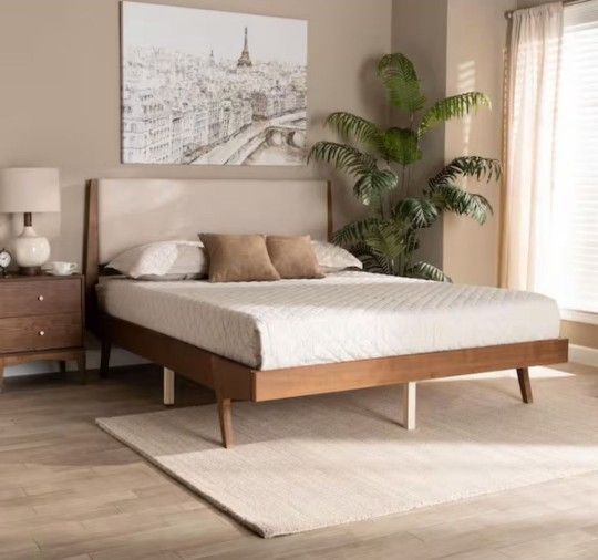 Mid-century Modern Style Queen Wood And Fabric Bed (NEW)Mattress Not Included!!