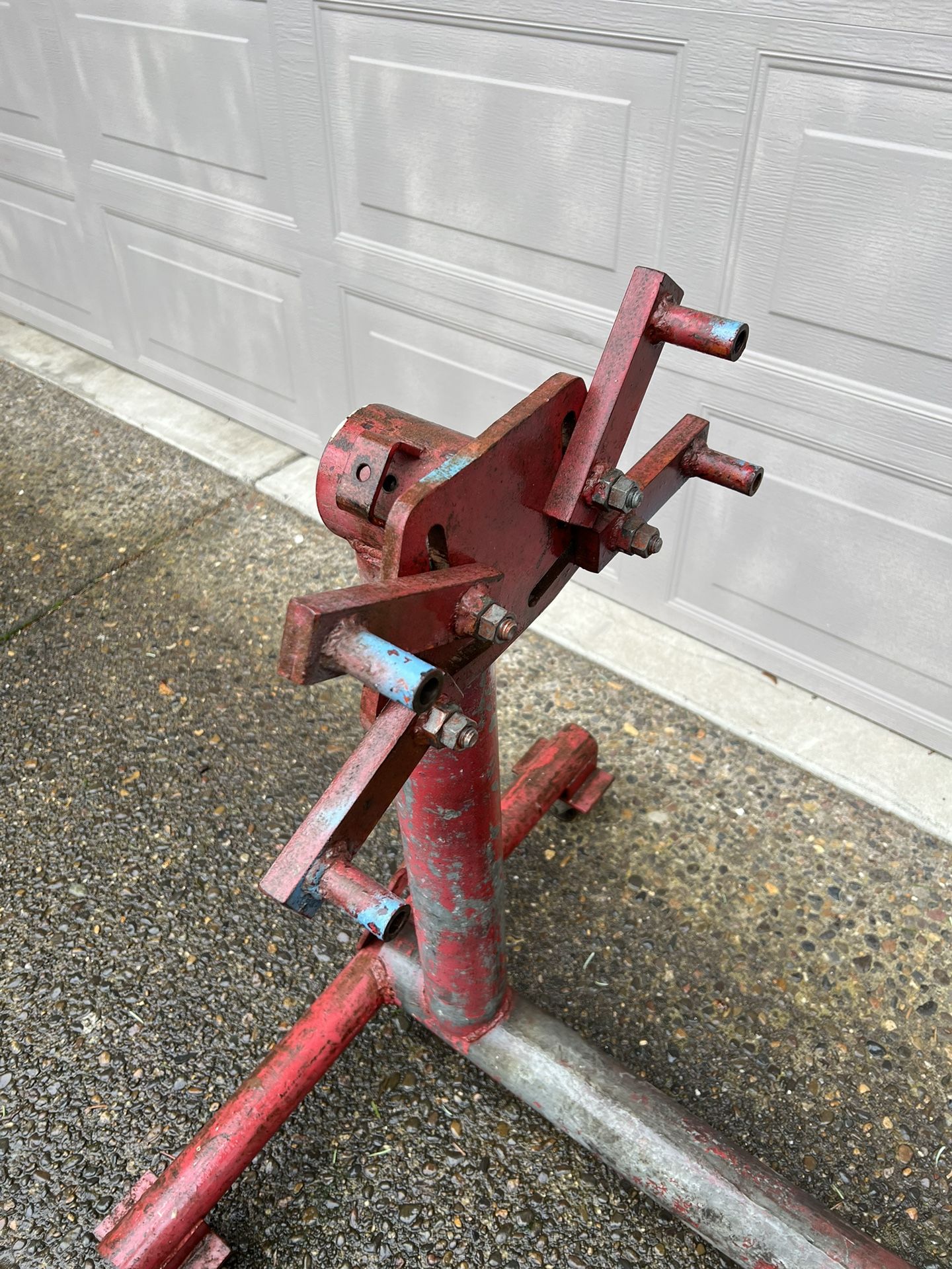 This stand was built 40 years ago to hold a 440 dodge long block also Chevy 6cyl steel wheels does not break down for storage.