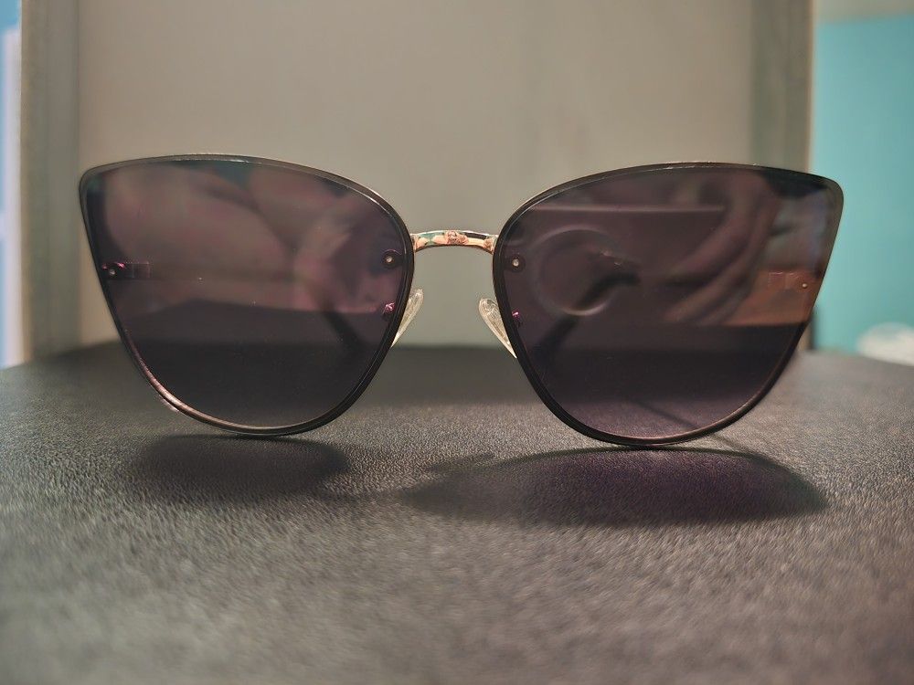 Oversized cat-eye Sunglasses, gold metal frame and hinges, black lenses.