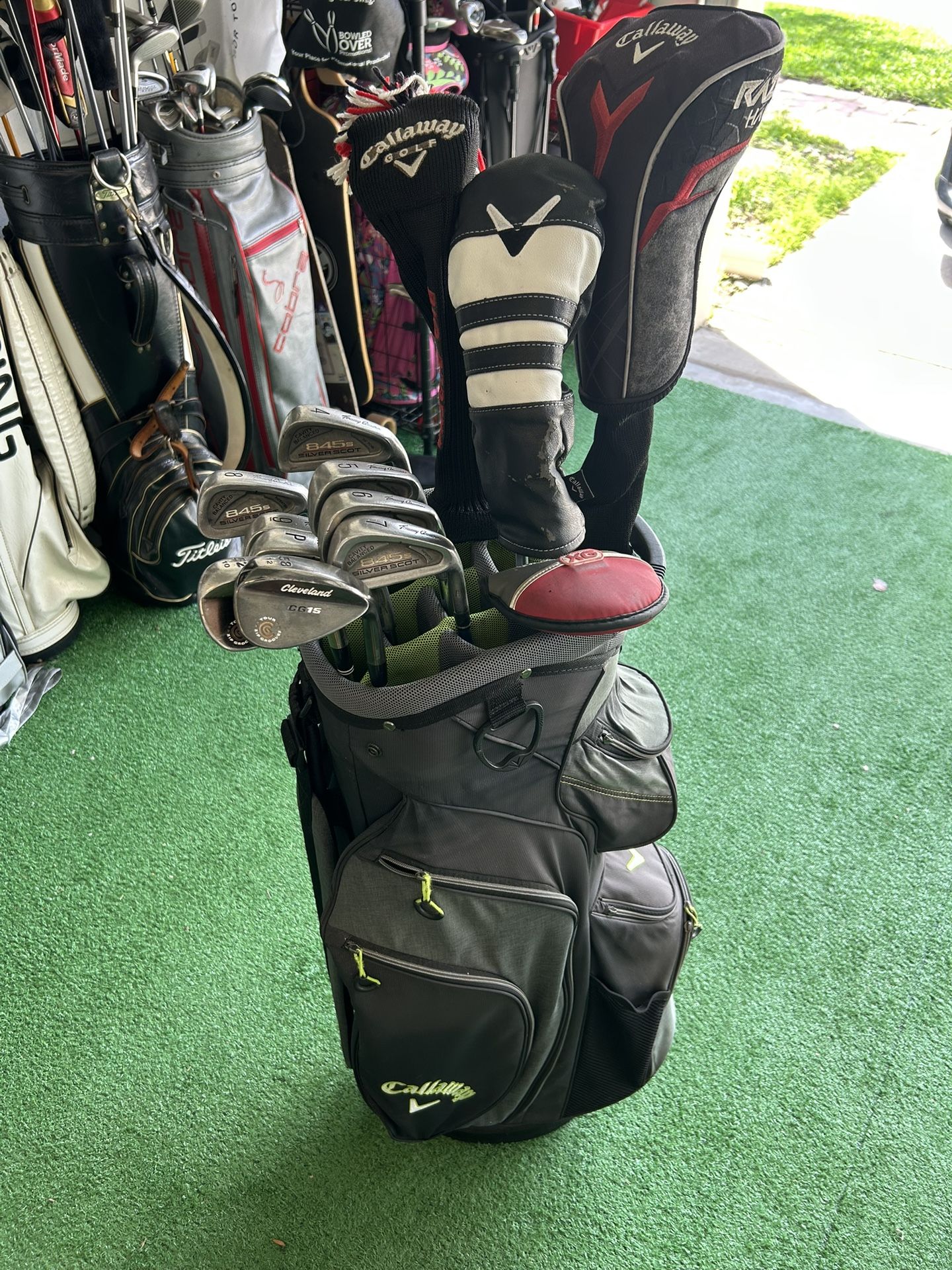 Callaway razr hawk driver +headcover Callaway epic gbb 3 wood and 5 wood Tommyarmor t irons 4,5,6,7,8,9,P Cleveland CG 15 wedges 52, 58 Odyssey Whitehot pro vline putter+headcover Callaway golf bag Headcovers included