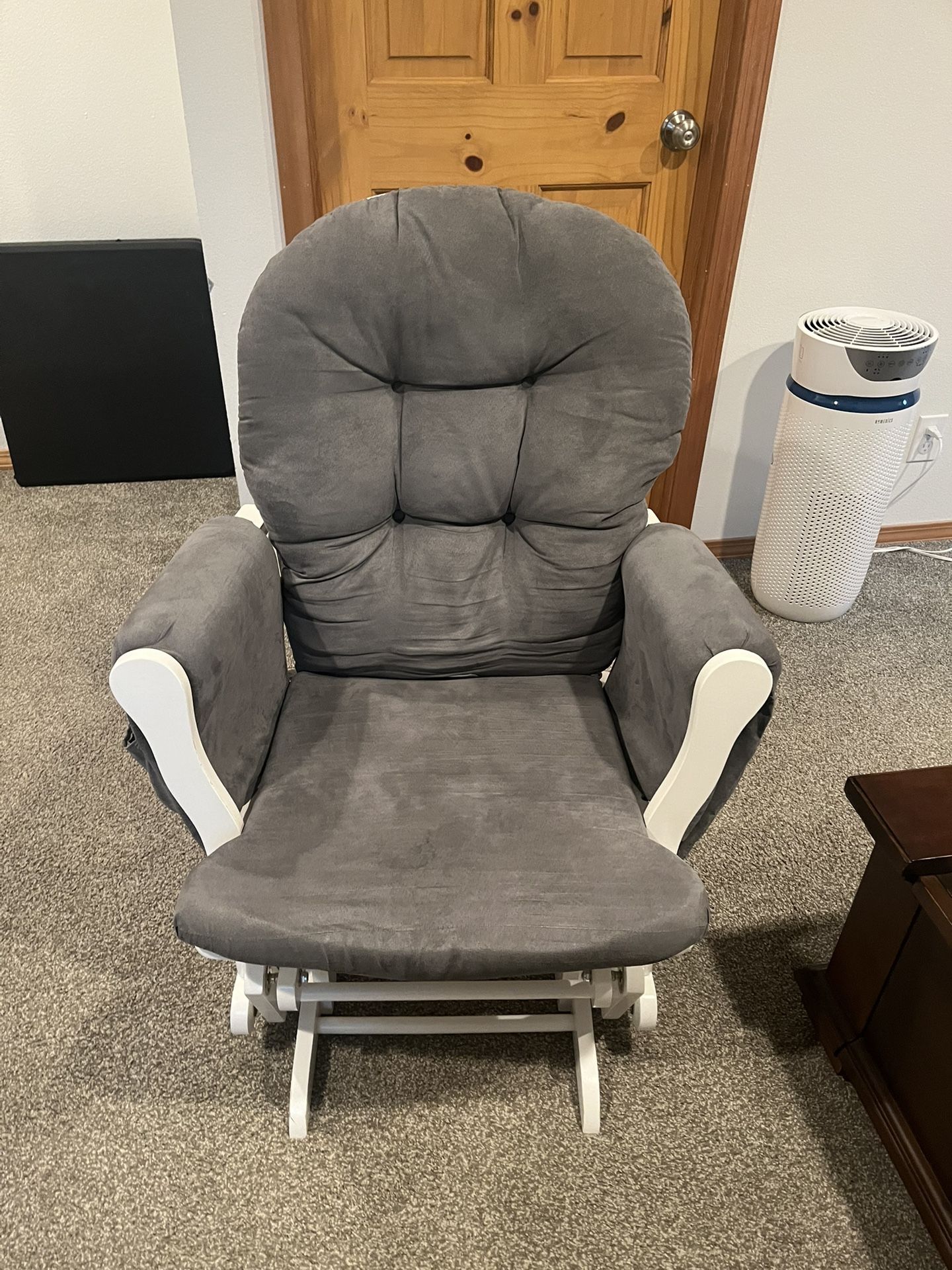 Storkcraft hoop glider nursery rocking chair. Very good condition all parts work. Nothing damaged. Very comfortable. No smoking or pets have been around it. Originally bought at target for $170 but only asking $50. Cash only. Fabric is grey, chair itself is white. Has pockets on both sides of chair.