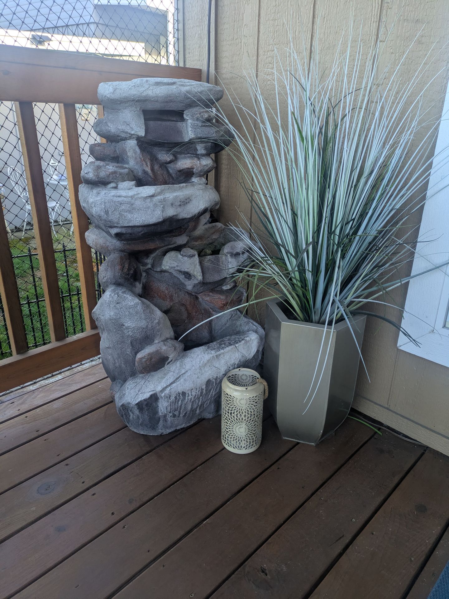 Used electric fountain. Works great. LED lights. Natural looking like rocks with multiple waterfalls. Great ambiance/sound for relaxing 39" H x 24" W