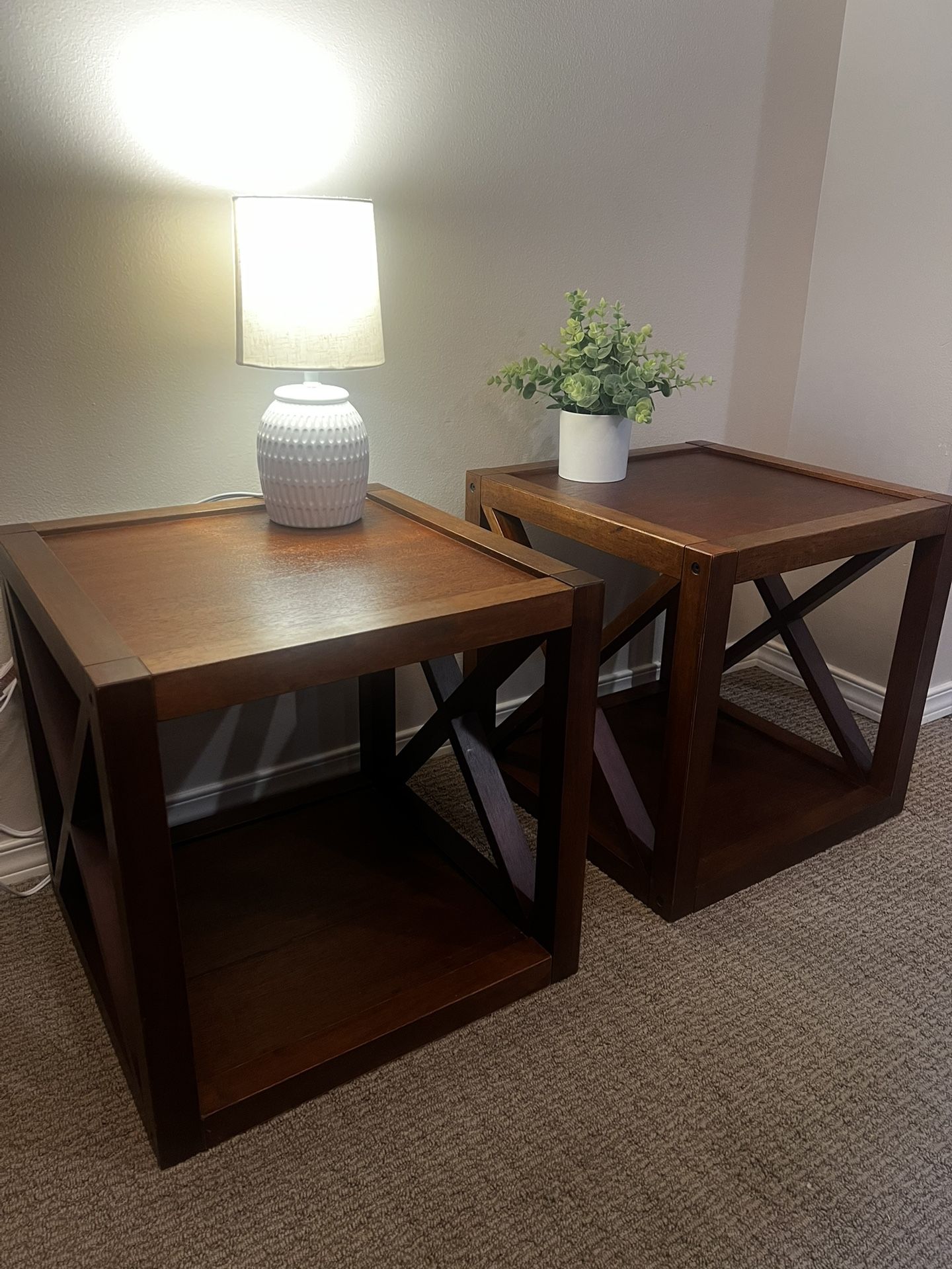 Art deco side table wooden cubes. Sturdy and includes lower shelf for storage. In good condition, but may have minor signs of use, including dings or scuffs but nothing significant. 18" x 18" x 18" Pickup in Covington or meetup in Factoria.