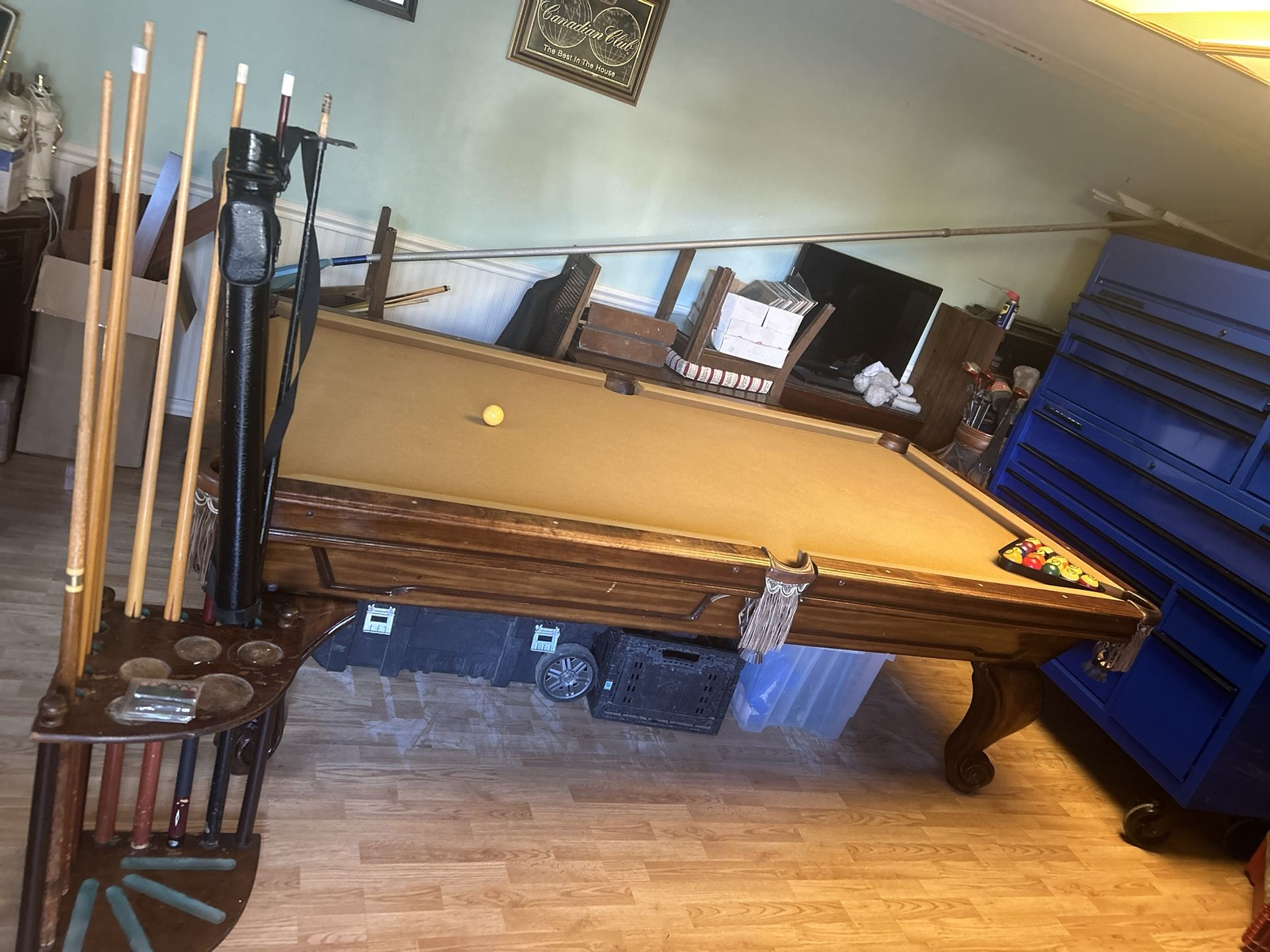 Beautiful pool table custom made by golden west billiards inc. also comes with all the balls , the triangle, eight pool sticks , pool stick carry case and the wooden pool stick holding table. And also the small pieces that go on the ends of the pool stick. It’s in really good condition. Hasn’t been used in years and it’s been covered this entire time. Asking 600$ for everything or best offer. Your more then welcome to come check it out, just message me to set up a date and time.