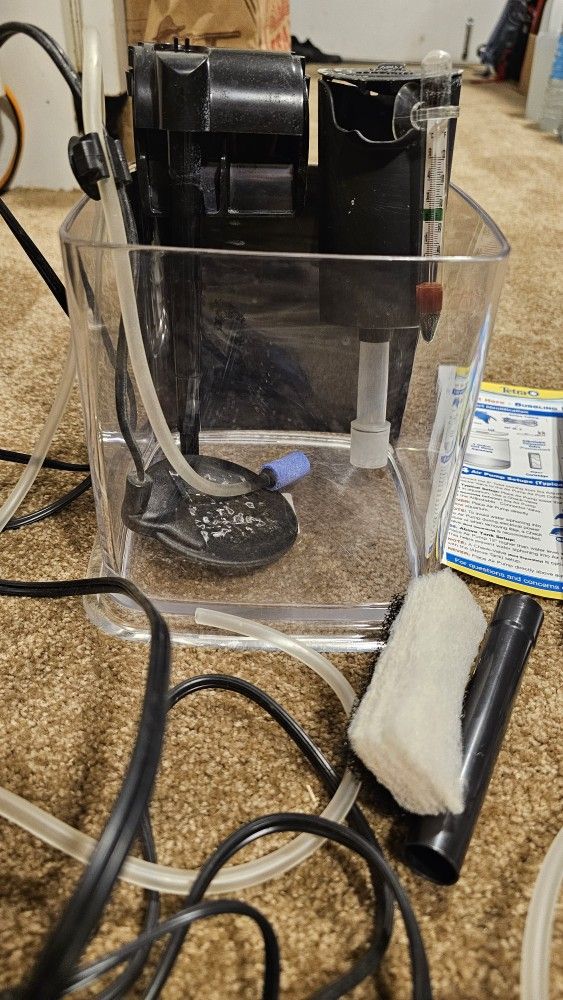 Just need an air pump and some fish! Includes tank, Red Sea nano filter, slim heater, thermometer, Tetra bubbling led kit, neon gravel. Take all for 25 bucks.