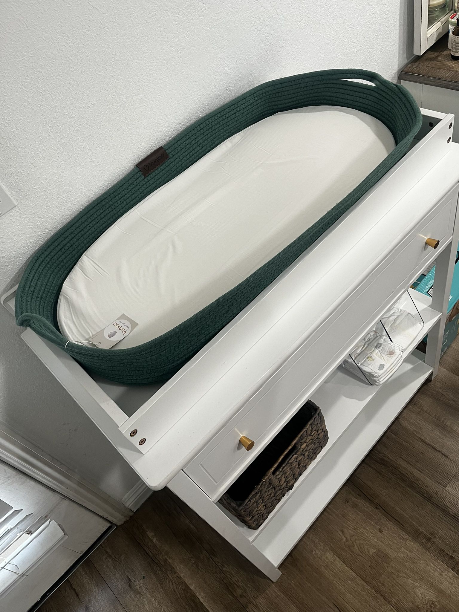 white changing table, has drower and 2 shelves. changing pad/ basket was bought separately but it included in price. hardly used still has tag on its like new condition.