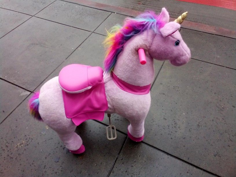 PonyCycle ride-on unicorn, your kid's best friend, combines ride-on toy with plush toy. Children are active. PonyCycle toy enables them to use their own power to drive. To a child, a stuffed animal is a companion they can interact with and relate to. • FEATURES - PonyCycle toy simulates riding on a real pony also steers left and right. • FUN - For indoor and outdoor use, boys and girls to ride whenever they want. • BREAK FUNCTION – Designed with a hand break, brings the pony to a secure stop. • UPDATED WHEELS – Without stop ring, it is upgraded for a smoother ride. Larger contact area makes more stable use. Small size Age range: 3-5 years old Weight limit: 55 lbs Product size:27.2*13*31.1in Medium size Age range: 4-9 years old Weight limit: 88 lbs Product size:33*15.8*38.2in
