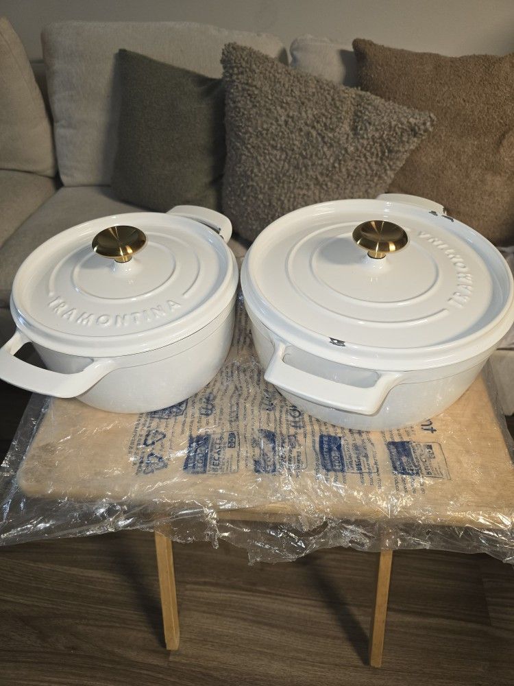 -ATTN DOES HAVE 2 SCOFFS ON EACH PAN- This versatile two‑piece set includes a 4‑quart and a 6‑quart round Dutch oven, both crafted from durable cast iron and finished with porcelain enamel interior and exterior. The self‑basting lids, precision‑cast stainless‑steel knobs, and compatibility with all cooktops make this set ideal for everything from weekday stews to special occasion roasting. Oven‑safe up to 450 °F and backed by a lifetime warranty, it gives premium performance.