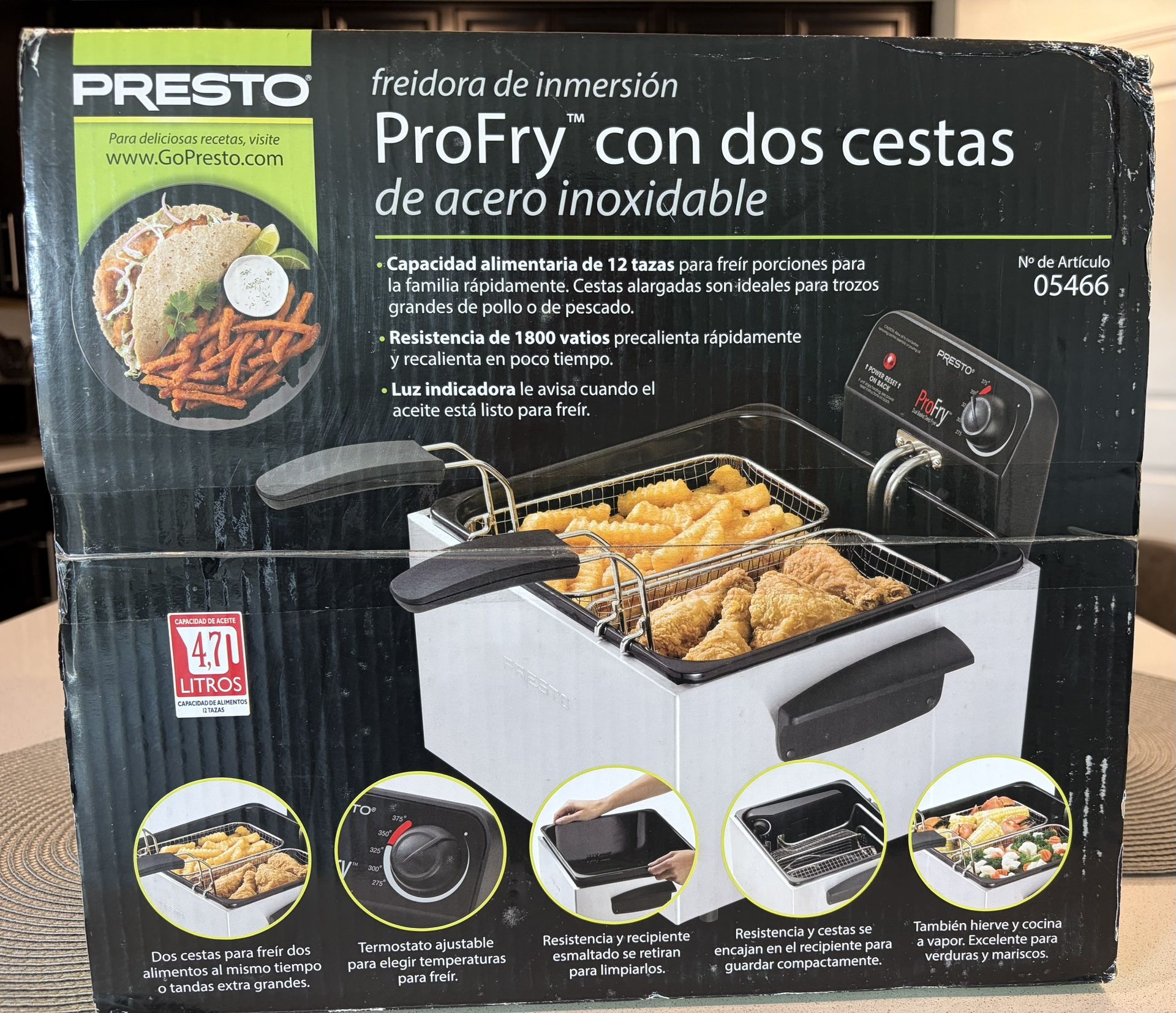 Brand new Presto Dual Basket Pro Fry deep fryer with immersion heating element. Never used and in original condition. Comes with two baskets to fry different foods at the same time, fast heating, and easy temperature control. Great for home cooking.