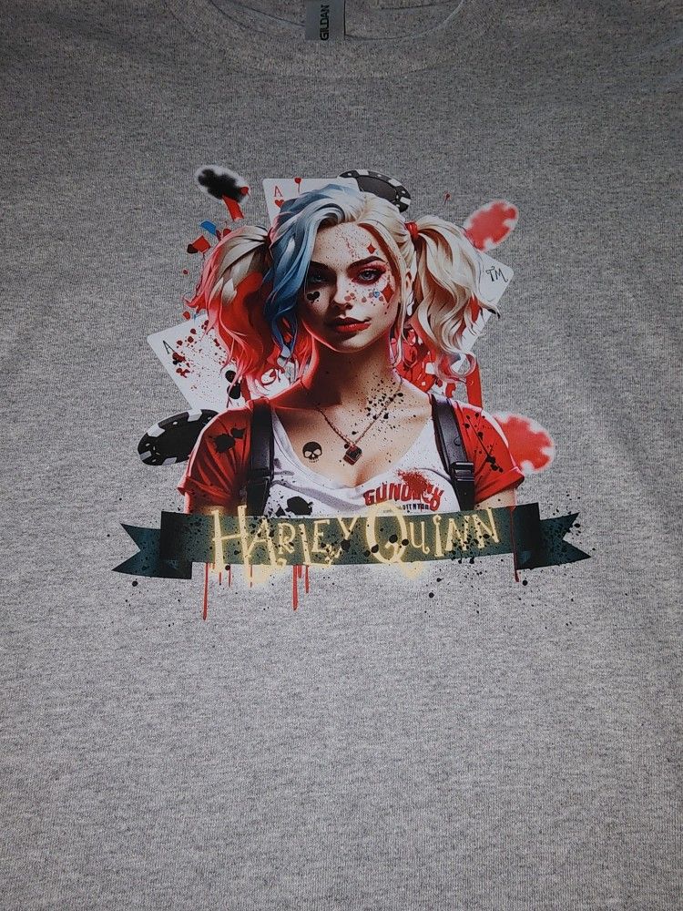 Super cute Harley Quinn design. Available in multiple shirt colors and sizes. Also available in crewnecks ($30) and hoodies ($40). Also available in kids size tees ($15). Located in Beaverton