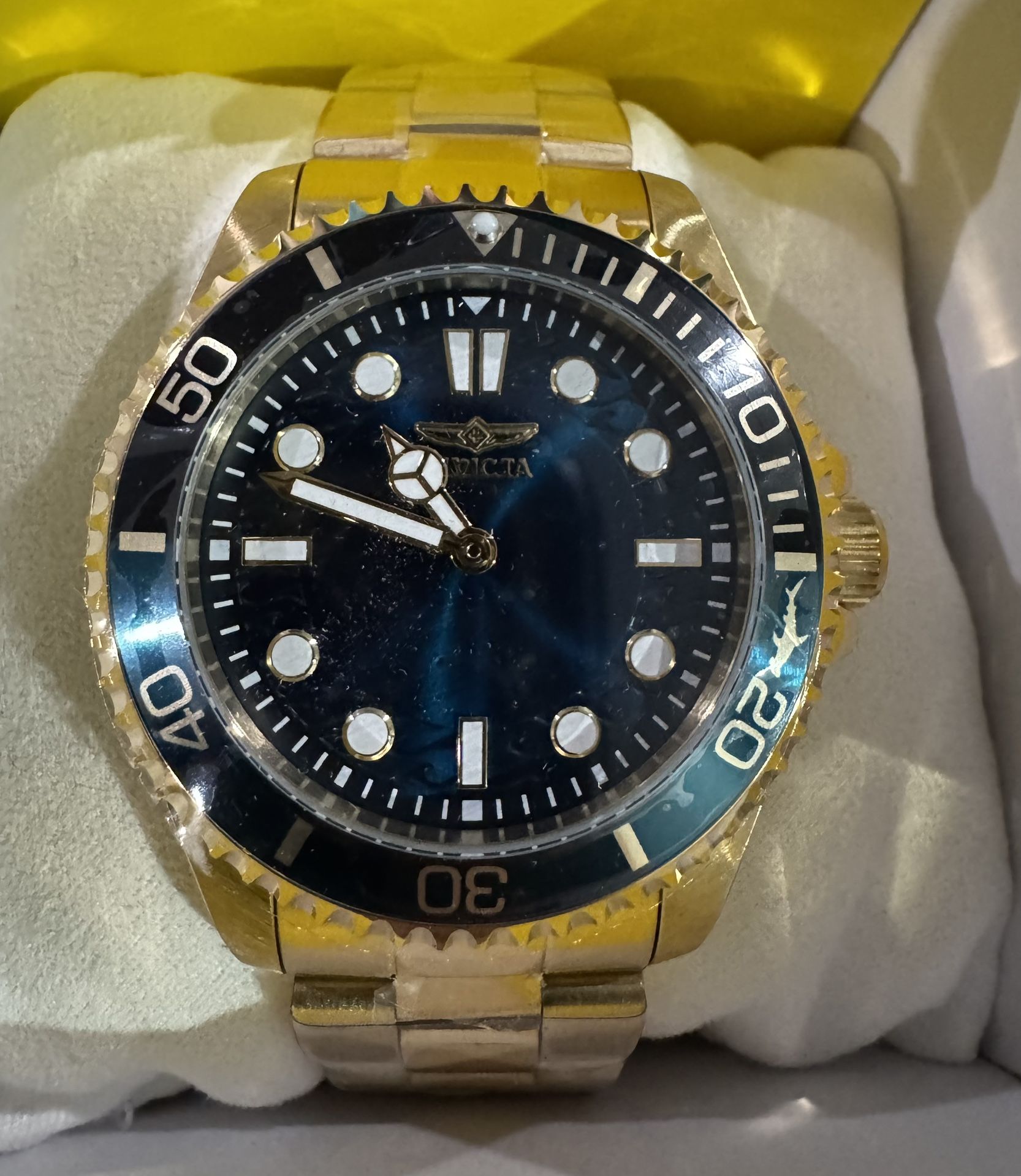 Invicta Men's Pro Diver Quartz Watch Brand New in box, Never Worn Manufacturer Invicta Gender Gents Water Resistancy 100 metres Movement Quartz, TMI PC32 Case material Stainless steel Case shape Round Case Width 43.00 mm Case Thickness 12.00 Dial color Blue Crystal Flame Fusion Strap Material Stainless Steel Strap Color Gold Strap Width 22.00 mm Product type watch