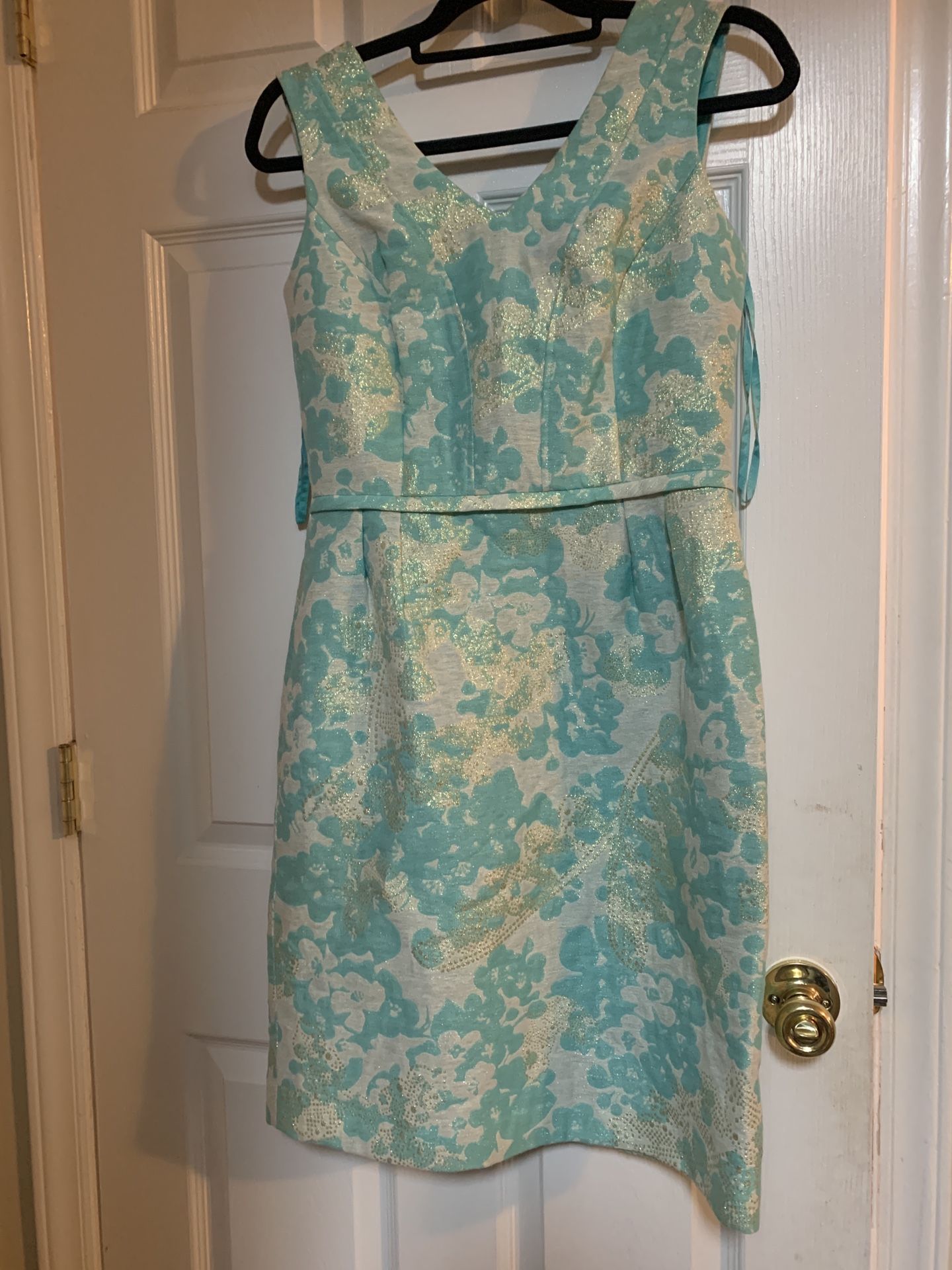 Great condition only worn once Beautiful cocktail dress modestly cut and cute! Has pretty gold embellishment