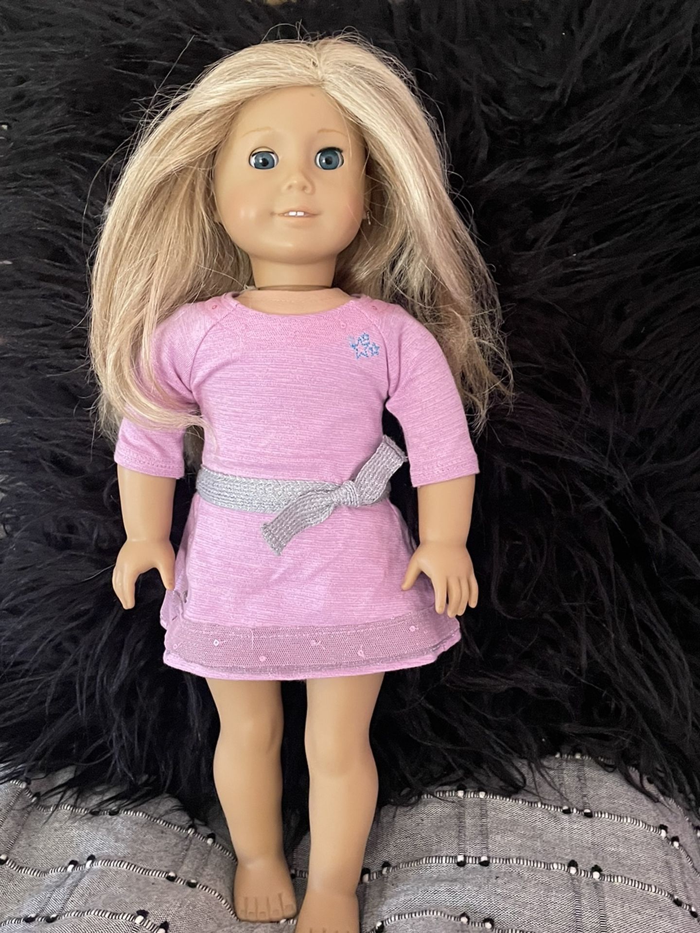 Pleasant company 18” doll , blonde hair blue eyes . The right eye lash it is there but get stuck . Her limbs looks tight . Her soft body is mostly clean but has couple of stain very small . Her vinyl limbs and face have few shine marks . She has couple if black marks on her legs and an orange probably crayon mark below her right foot . She has ear piercing and earrings .