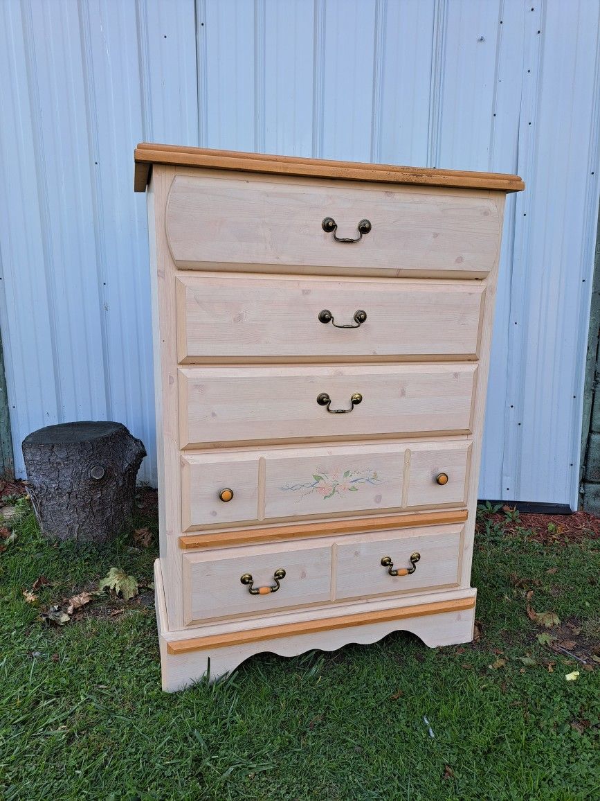 4' Tall 5 Drawer Wood Dresser with Decorative Stencils Dresser is in overall good shape. Has minor cosmetic damage to the top which is pressed wood. The rest of it is real wood Including drawer bottoms. Measures 4' Tall x 34" w8de x 16" deep