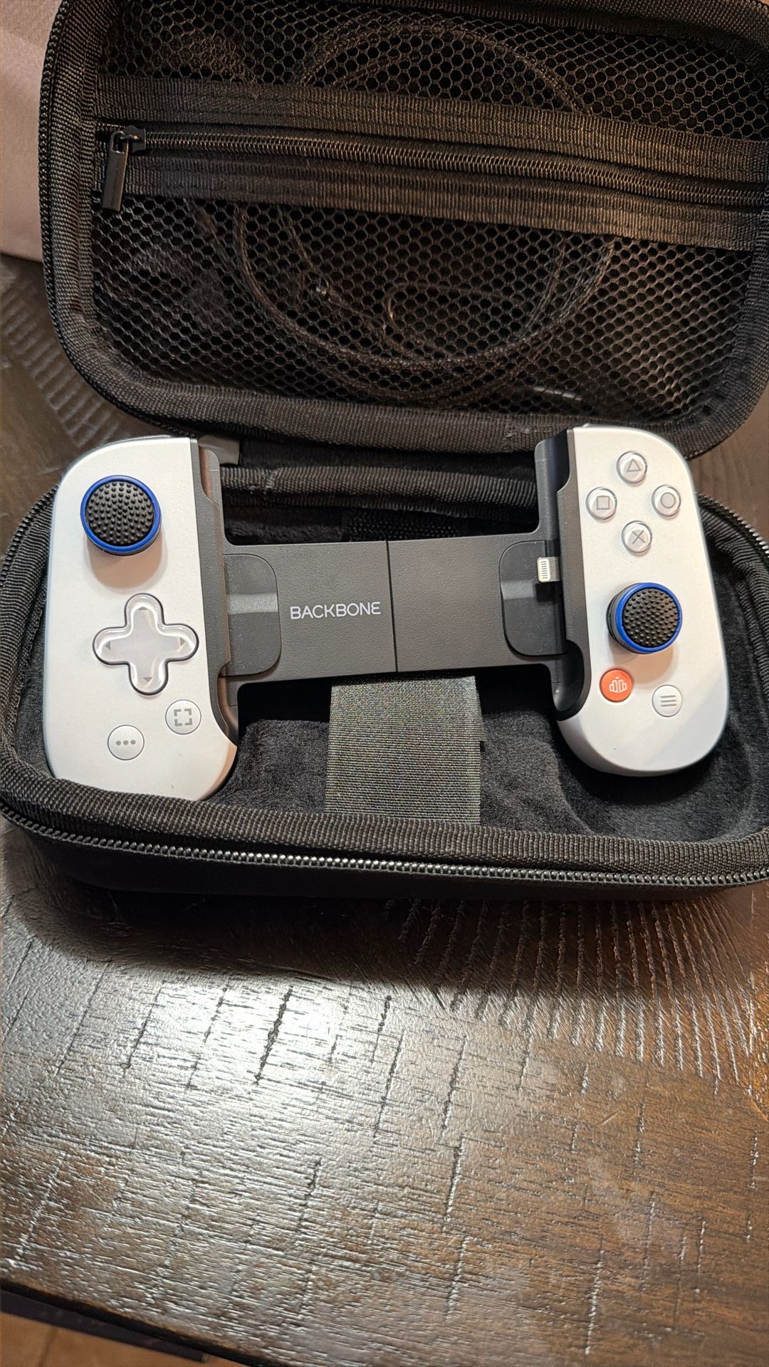 Backbone One Playstation Edition iPhone with Lightening Charger Compatible Rarely used, hardly any wear. Like New! Comes with: Hard Shell travel case Analog Grips Lightening Charger Cable for Backbone for endless mobile gaming