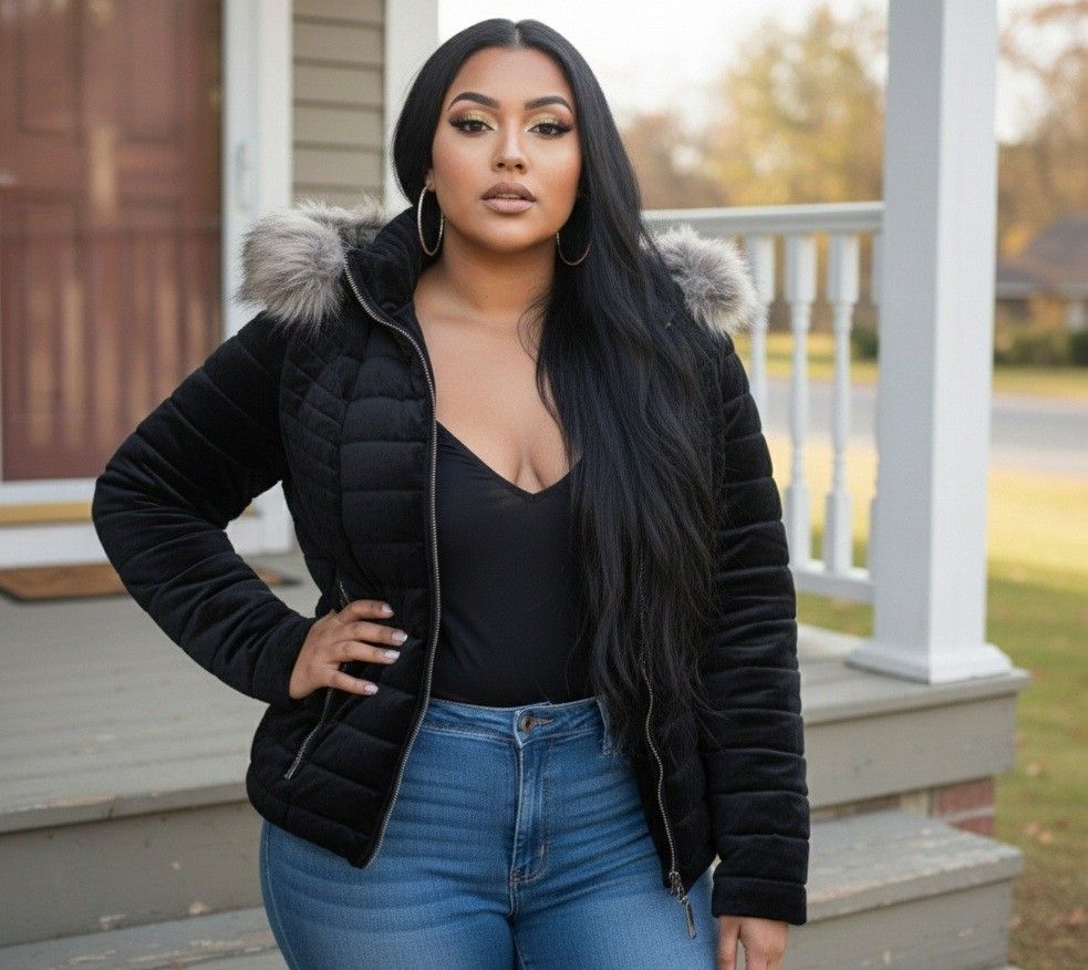 Velvet Puffer Jacket Hooded Size XL Removable Faux Fur Front Zipper Zipper Pockets Silver Hardware Shell: 100% Polyester Lining: 100% Polyester Fur Lining: 100% Polyester Faux Fur: 55% Modacrylic 45% Acrylic