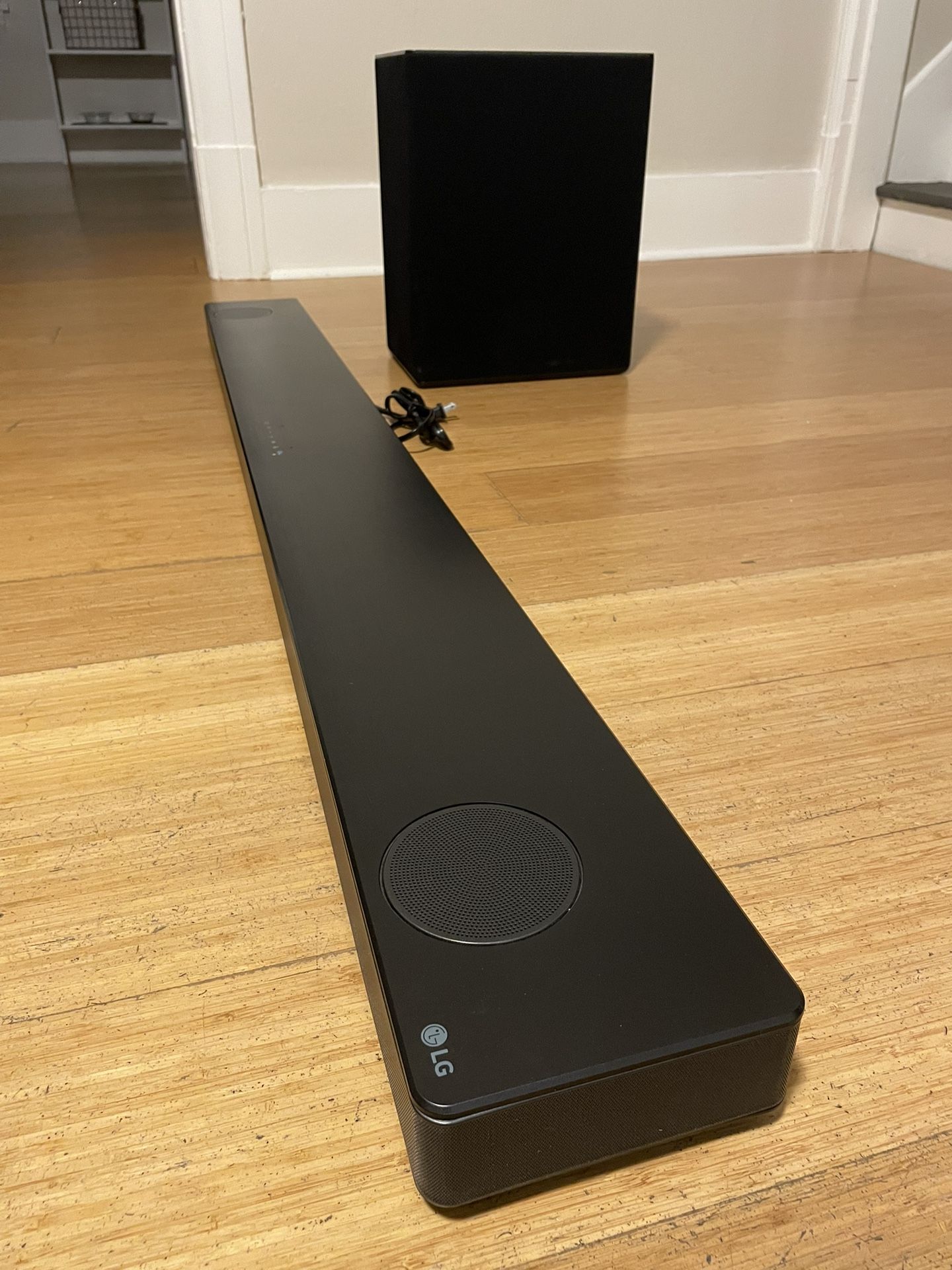 56” sound bar and wireless subwoofer. Supports optical and HDMI ARC inputs. The condition is like new, with remote and original mounting instructions (optional, if you want to attach it directly to a compatible LG TV).