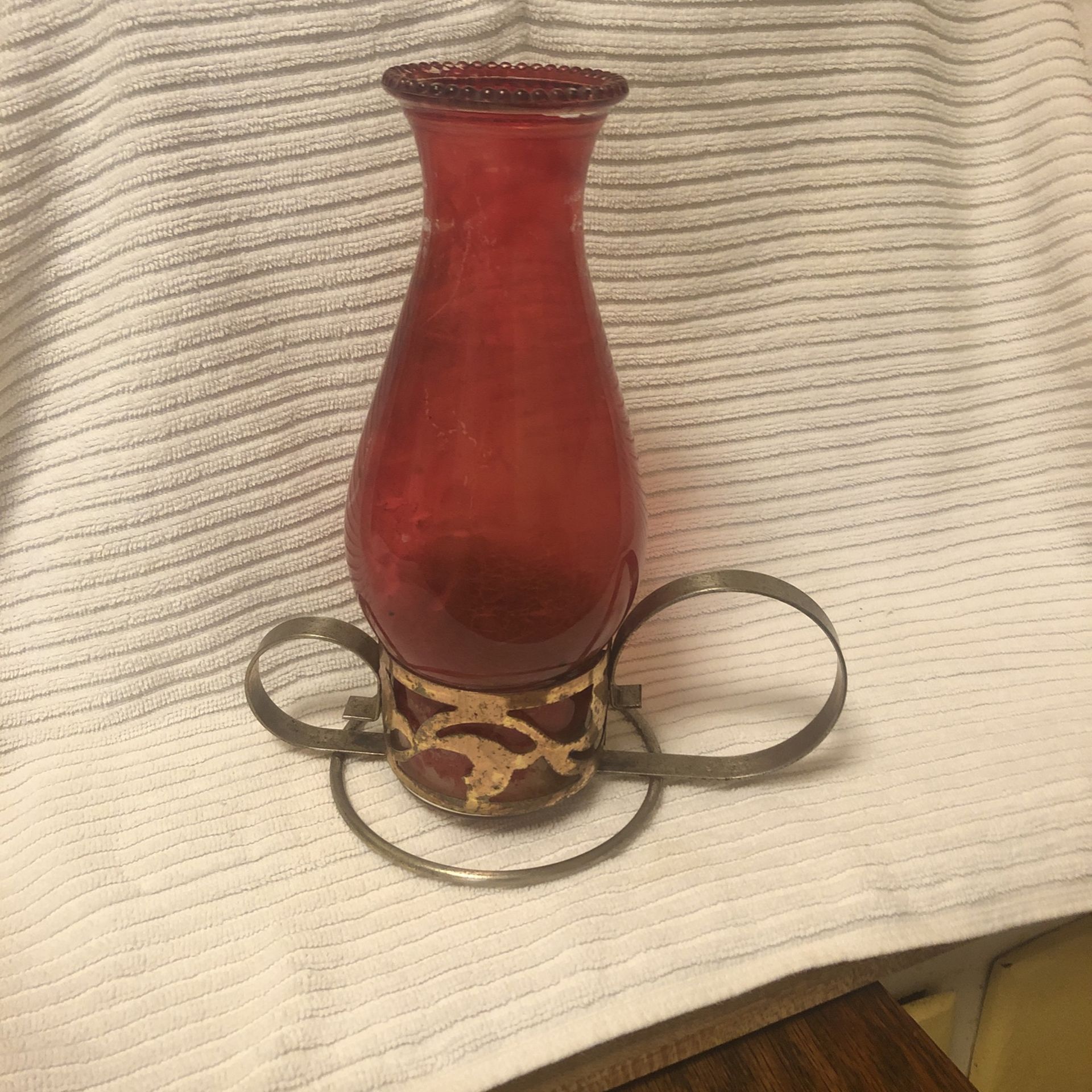 YES STILL AVAILABLE, Thank You For Not Asking. ** Cranberry Ruby red glass candle light chimney and ornate metal chambermaids Hurricane lamp chimney holder. ******FIRST $7.00 GETS IT! ****** No holding- First come first served- NO meetups- Local pickup front porch or curbside- CASH and Carry!