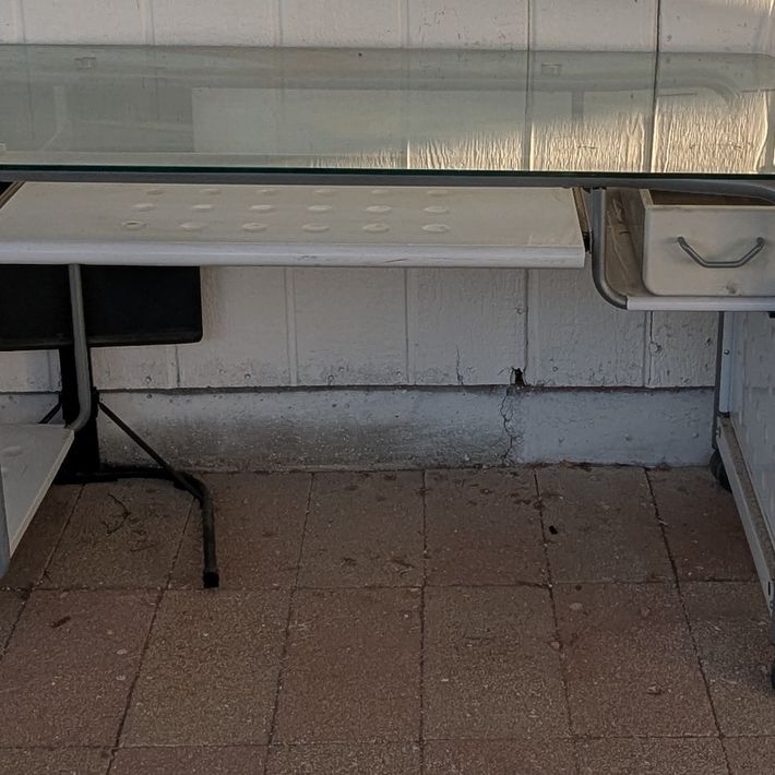 Industrial Tempered Glass and Metal Desk. File Cabinet and Storage 3 pieces Desk is 56" x 28" x 29 1/2" Tall File Cabinet is 19 1/2 " x 17" x 29 1/2" Tall Storage Cabinet is 28" x 17 x 29 1/2" Tall Excellent Condition. Locking wheels roll smoothly $150