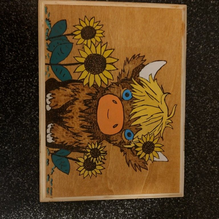 Bring warmth and charm into your home with this handcrafted wood-burned Highland calf artwork. Expertly created using traditional pyrography techniques, this adorable shaggy calf is full of personality—from its bright blue eyes and tousled golden fringe to its softly shaded, textured coat. Surrounded by cheerful sunflowers and rich green leaves, the design radiates rustic farmhouse appeal. The natural wood grain provides a warm honey-toned background, beautifully complementing the detailed burn work and hand-painted accents. Each line and shade has been carefully crafted, making this piece truly one of a kind. Perfect for country décor lovers, farmhouse-style homes, nurseries, or as a thoughtful gift for animal and sunflower enthusiasts, this artwork adds a cozy, heartwarming touch to any space. Ready to display, it’s a sweet statement piece that brings a little sunshine and countryside charm wherever it’s placed.