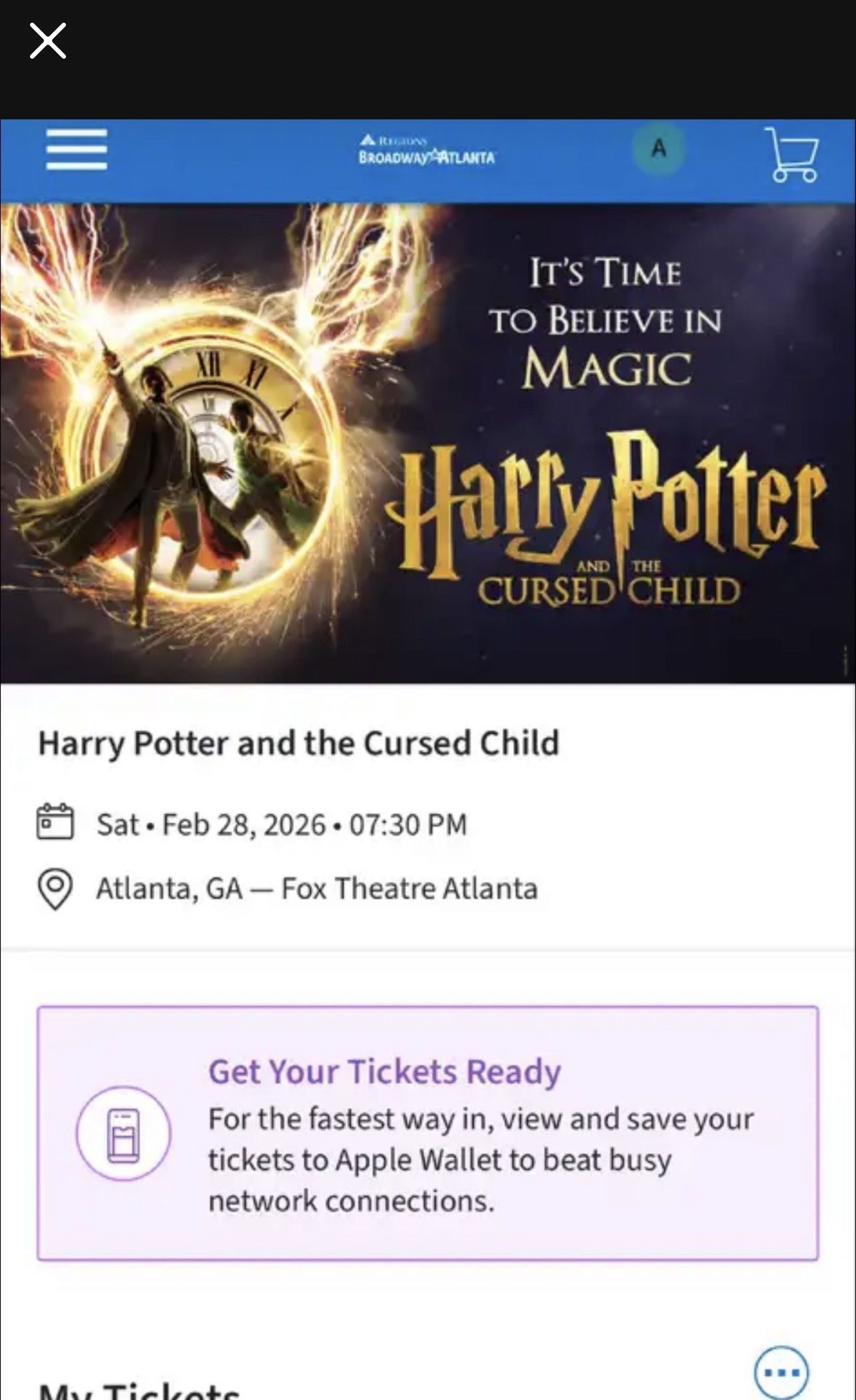 Two tickets for Harry Potter and the Cursed Child at the Fox Theatre. Saturday, Feb 28, 2026, 07:30 PM. Section SRA