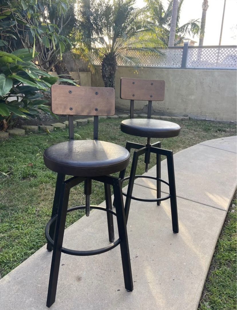 2 used amisco bar stool chairs: Amisco Architect Screw Upholstered Steel seat w/ wood Super sturdy and built well See last photo for specified details & retail price In good working condition- some very minor rust from living near beach & wear on leather cushions 1 chair missing floor protector so unbalanced- can remove all or one can be added Originally $559 each #barstools #amiscochairs #leatherchair #adjustablebaratools #realwoodchairs #amiscofurniture #rustic #classy