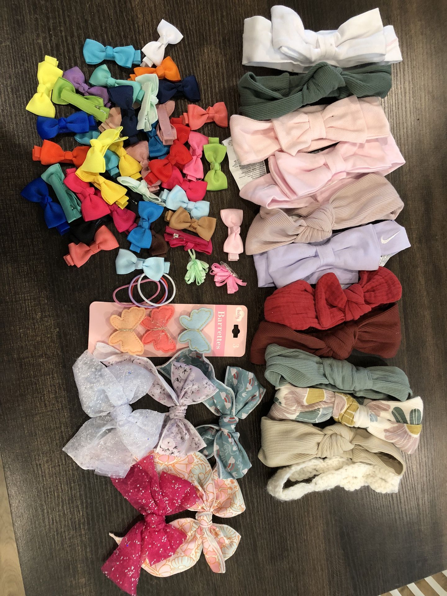 12 soft headbands (several Nike brand) 3 butterfly clips 5 large hair bows (clips) 4 small hair ties 43 small bow clips All brand new never used, a couple lightly dirty from being stored in a storage unit (can be cleaned easily) Asking 15 for all OBO Check page for other children’s clothes/accessories !!!