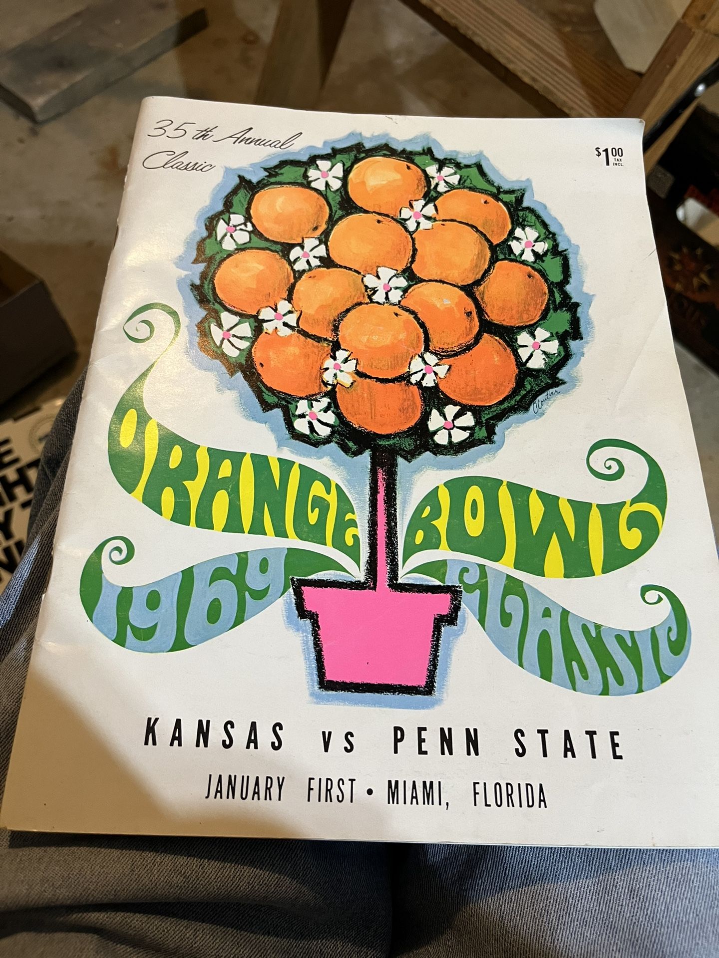 Penn State played Kansas at the Orange Bowl in Miami Florida. Penn State beat Kansas 15 to 14. Great shape no torn pages!!