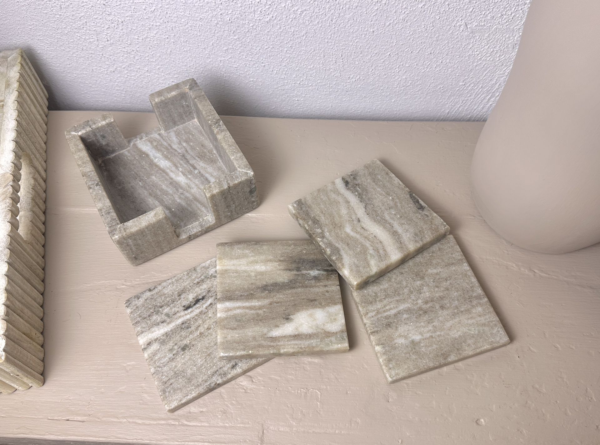 Brand new! Never used Set of 4 Grey/Sand Marble Coasters Sizes: 4x4x0.5” Weight: 5 lbs Color: Grey/Sand Material: marble