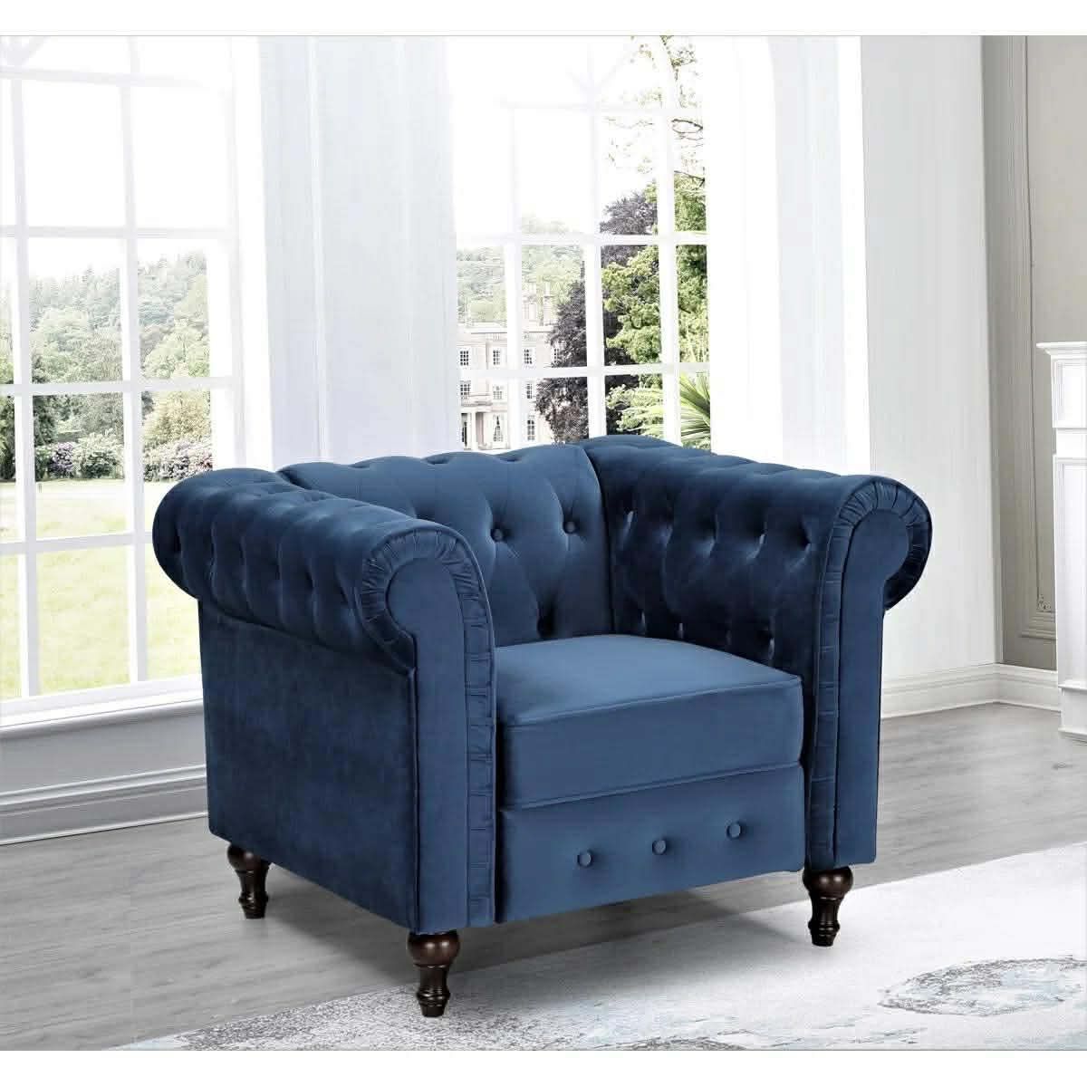 Modern Velvet Tufted Accent Sofa Couch Chair with Scroll Arms and Nailhead. (Blue)