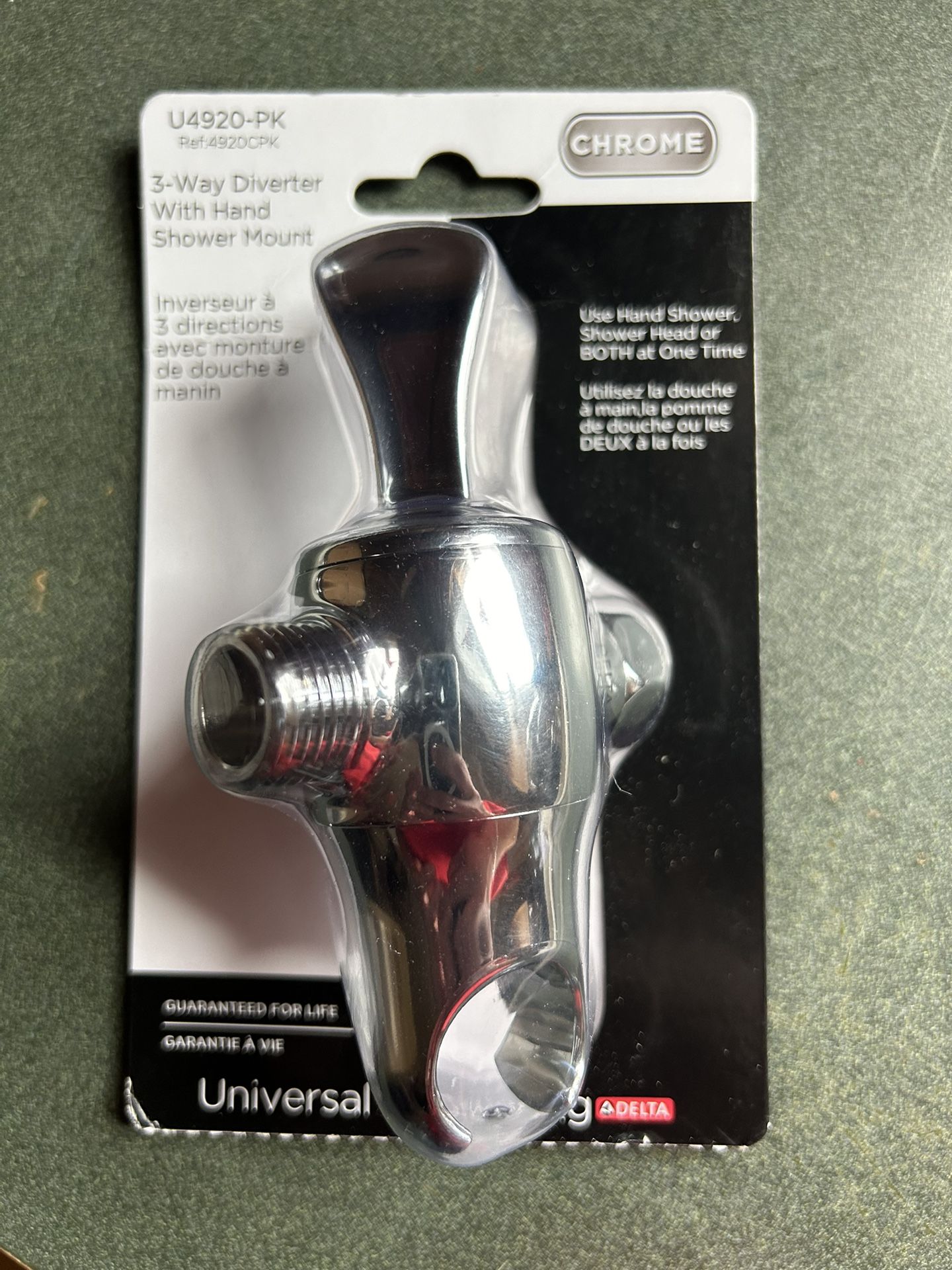 Brand new in package Sells for $35 and higher in stores This 3-Way Shower Arm Diverter with Handshower Mount in Chrome, combined with a handshower (sold separately) is a quick and easy way to update your shower. You can count on Delta reliability throughout the home, including our accessories and repair parts. We back each and every item with our lifetime limited warranty. Brass construction ADA flip lever control 1/2 in. IPS female inlet 1/2 in. IPS male outlet
