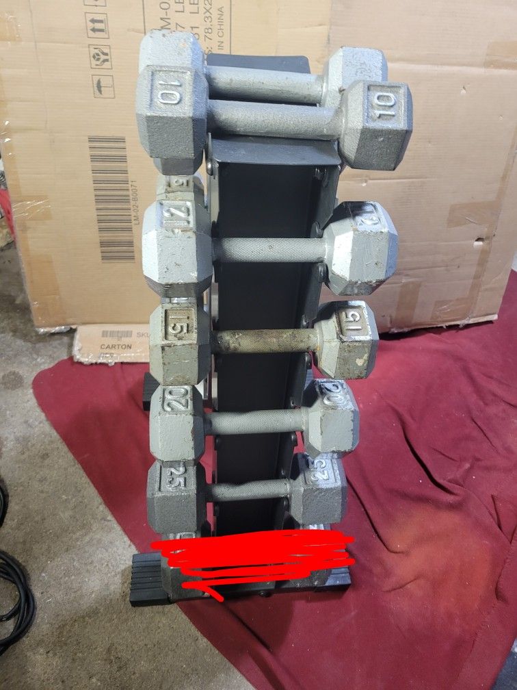 SET OF 10s 12s. 15s 20s. 25s. HEXHEAD DUMBBELLS TOTAL 164LBs AND A-FRAME RACK 11525 S HALSTED DUNKIN DONUTS/7111.S WESTERN WALGREENS 175$ CAS