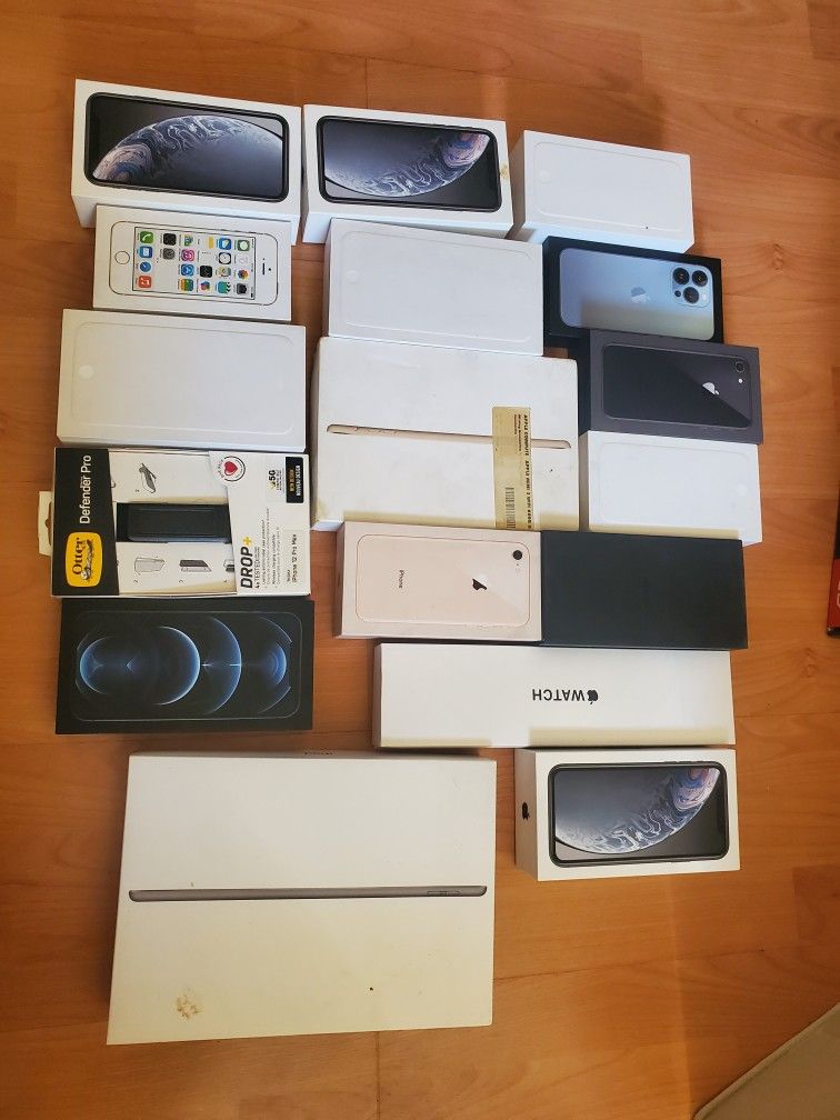 The boxes for various iPhones old and recent models, 1 Samsung box 1 box - $5 Full set - $40 ACCEPTING OFFERS I'm not sure which models exactly are here, iPhone 5s, 6+, and X for sure though Come in various conditions