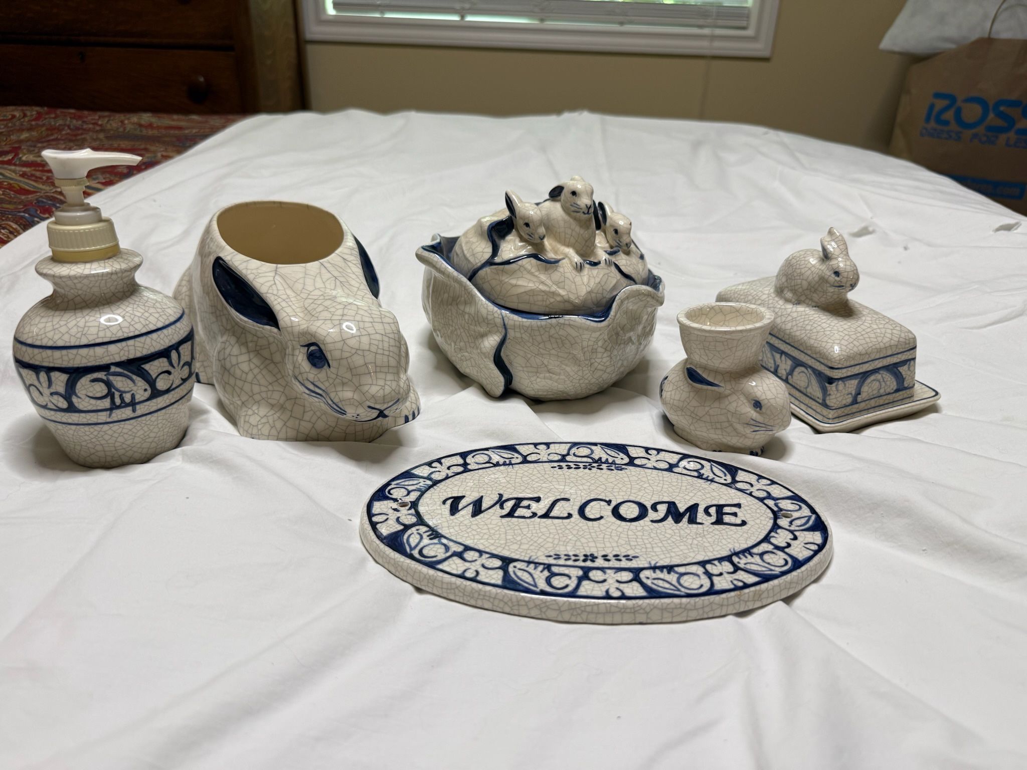 A ceramic bunny welcome sign, a bunny butter tray, a bunny egg carrier, a ceramic bottle with pump top, a large bunny-shaped bowl , and a covered bowl with a bunny family figurine on the lid.