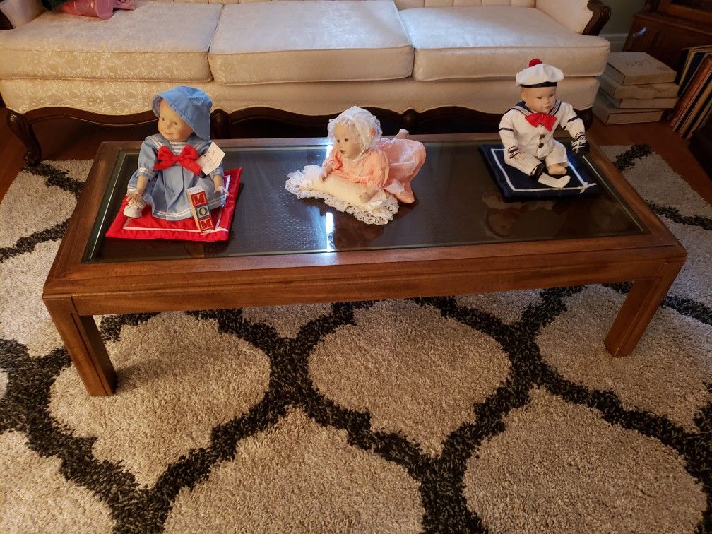 Beautiful Basset Glass Top Coffee Table with Wood Base. Brown Weave Design under glass and Gold Trim Accent. In good condition. Measures 15 x 53 x 22 (Dolls not included) Sacrifice, asking on $100