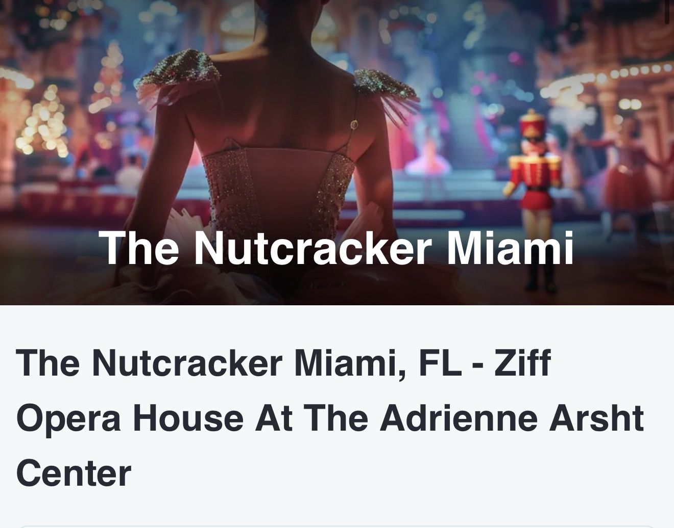 Tickets Miami city Baller Presents Adrienne Arsht Center 1300 Biscayne Blvd Miami, Fl 33132 George Balanchine’s The nutcracker 5 tickets Sunday, December 28, 2025 5:00 pm