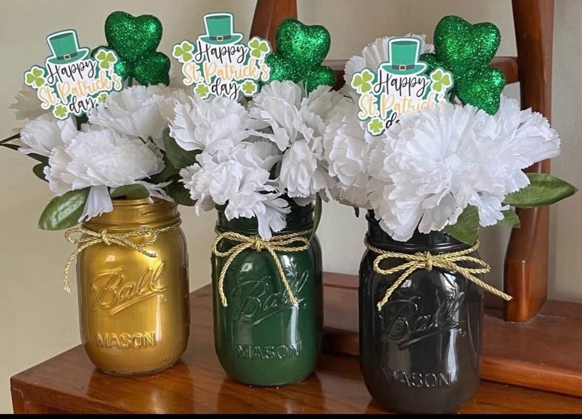 3 Mason Jars | It’s your lucky day! Celebrate St. Patrick’s Day with these lovely trio Featuring a glitter shamrock, Happy St. Patrick’s Day pick, white faux carnations and finished with gold twisted cord. These Mason jars are perfect for gift giving and a great addition to your home and holiday decor. DESCRIPTION * PREMIUM QUALITY: chalk paint on the INSIDE for a clean look. Includes jute twine accent on top. Includes faux flowers * SIZE = pint-sized about 5.75" x 3.5“ and a 16-ounce capacity * Check out my other Mason jar designs * Contact if you need more than 3 jars #stpatty #shamrock #gift #spring #holiday #kitchen #farmhouse #glass #vase #container #masonjar #irish #green